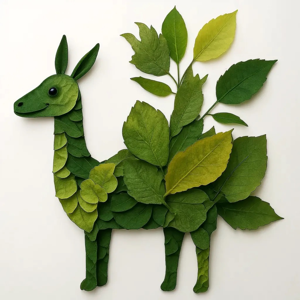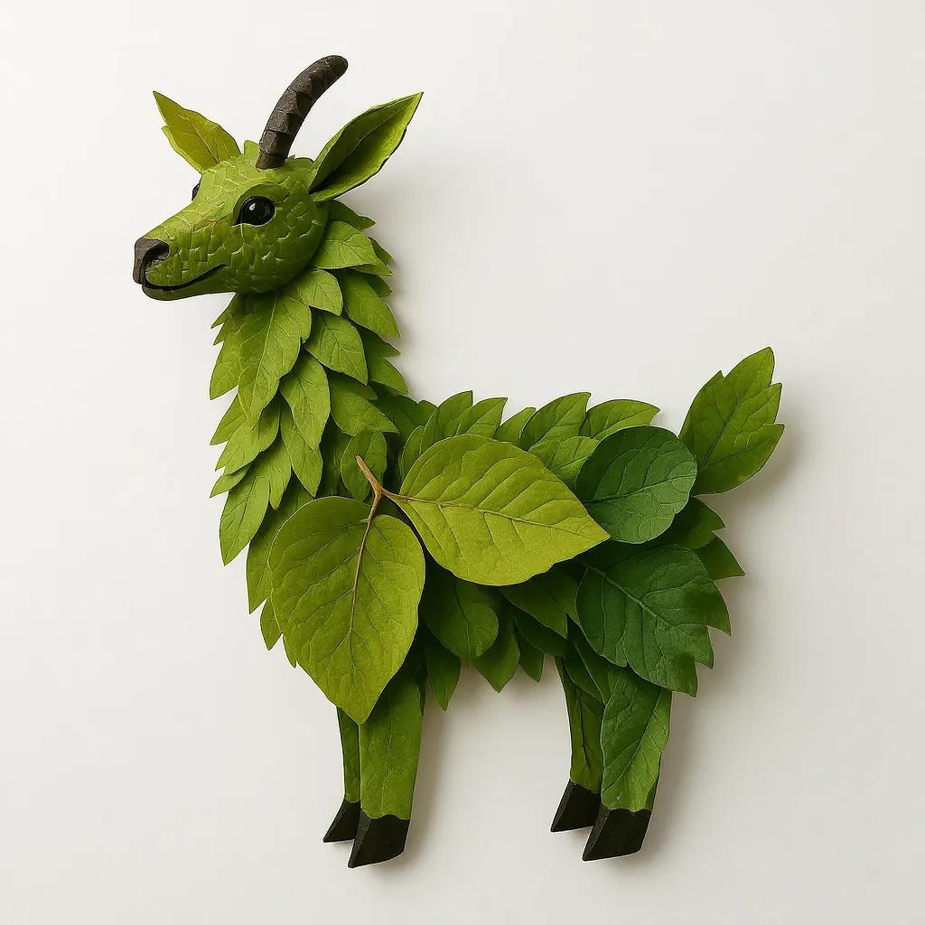 a llama made entirely from natural leaves, creative leaf collage art, layered green and dry leaves forming body, face and clothes, visible leaf veins and textures, handcrafted botanical art style, clean white background, top-down flat lay composition, highly detailed, soft natural lighting, realistic leaf textures, 8k
