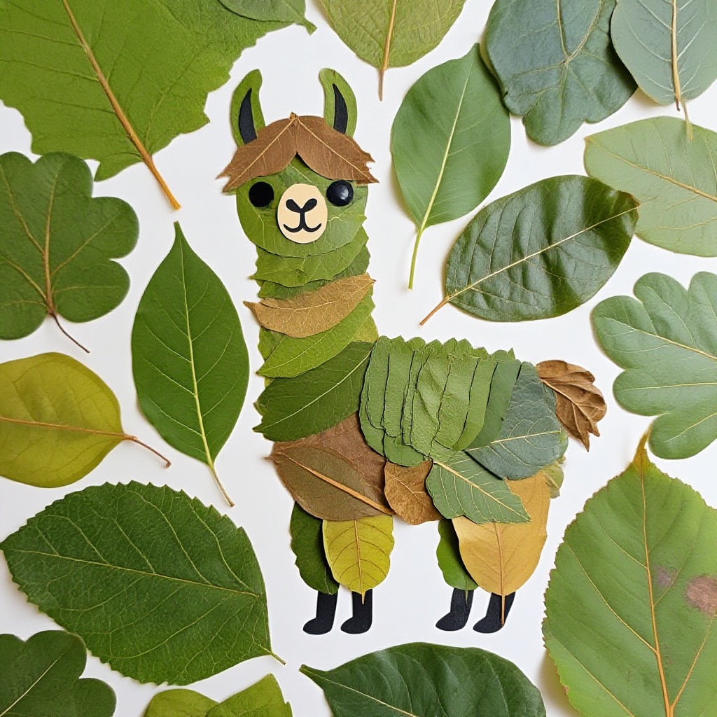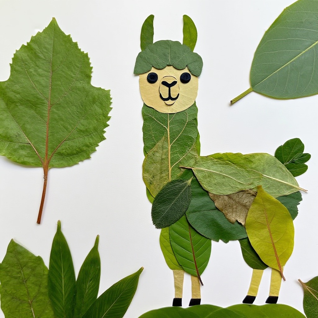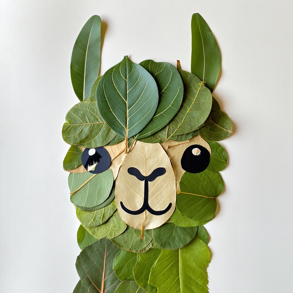 a llama made entirely from natural leaves, creative leaf collage art, layered green and dry leaves forming body, face and clothes, visible leaf veins and textures, handcrafted botanical art style, clean white background, top-down flat lay composition, highly detailed, soft natural lighting, realistic leaf textures, 8k