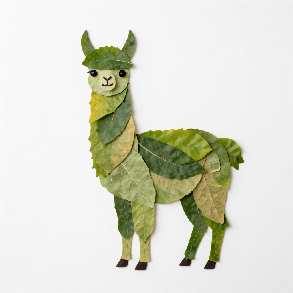 a llama made entirely from natural leaves, creative leaf collage art, layered green and dry leaves forming body, face and clothes, visible leaf veins and textures, handcrafted botanical art style, clean white background, top-down flat lay composition, highly detailed, soft natural lighting, realistic leaf textures, 8k