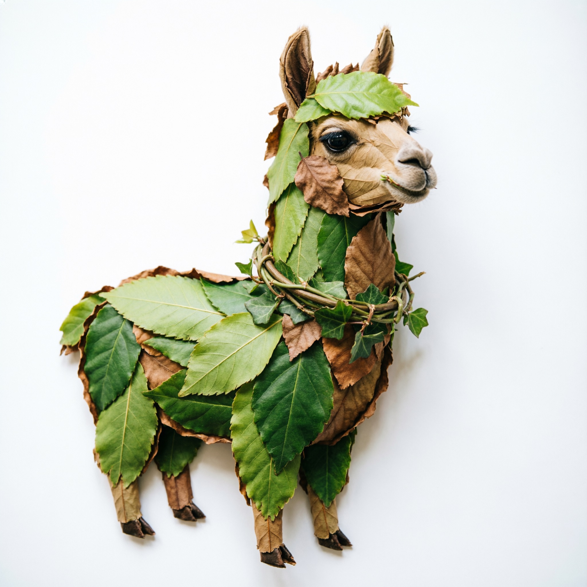 a llama made entirely from natural leaves, creative leaf collage art, layered green and dry leaves forming body, face and clothes, visible leaf veins and textures, handcrafted botanical art style, clean white background, top-down flat lay composition, highly detailed, soft natural lighting, realistic leaf textures, 8k