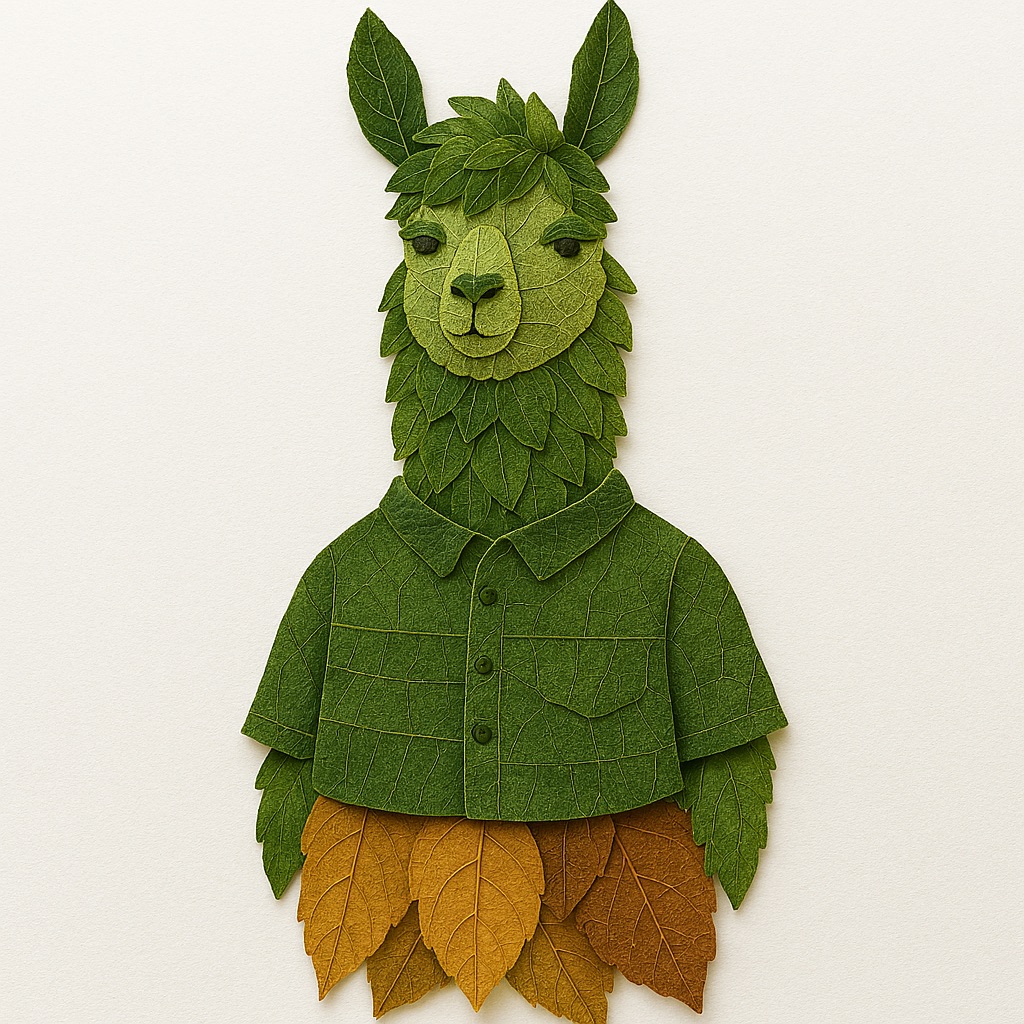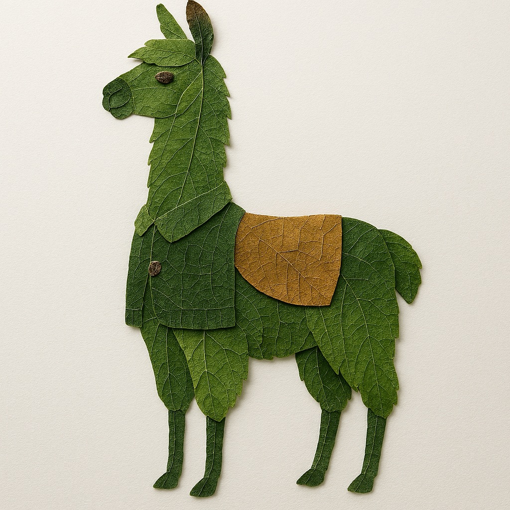 a llama made entirely from natural leaves, creative leaf collage art, layered green and dry leaves forming body, face and clothes, visible leaf veins and textures, handcrafted botanical art style, clean white background, top-down flat lay composition, highly detailed, soft natural lighting, realistic leaf textures, 8k