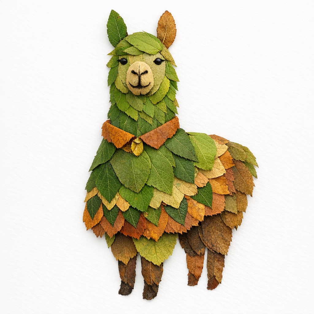 a llama made entirely from natural leaves, creative leaf collage art, layered green and dry leaves forming body, face and clothes, visible leaf veins and textures, handcrafted botanical art style, clean white background, top-down flat lay composition, highly detailed, soft natural lighting, realistic leaf textures, 8k