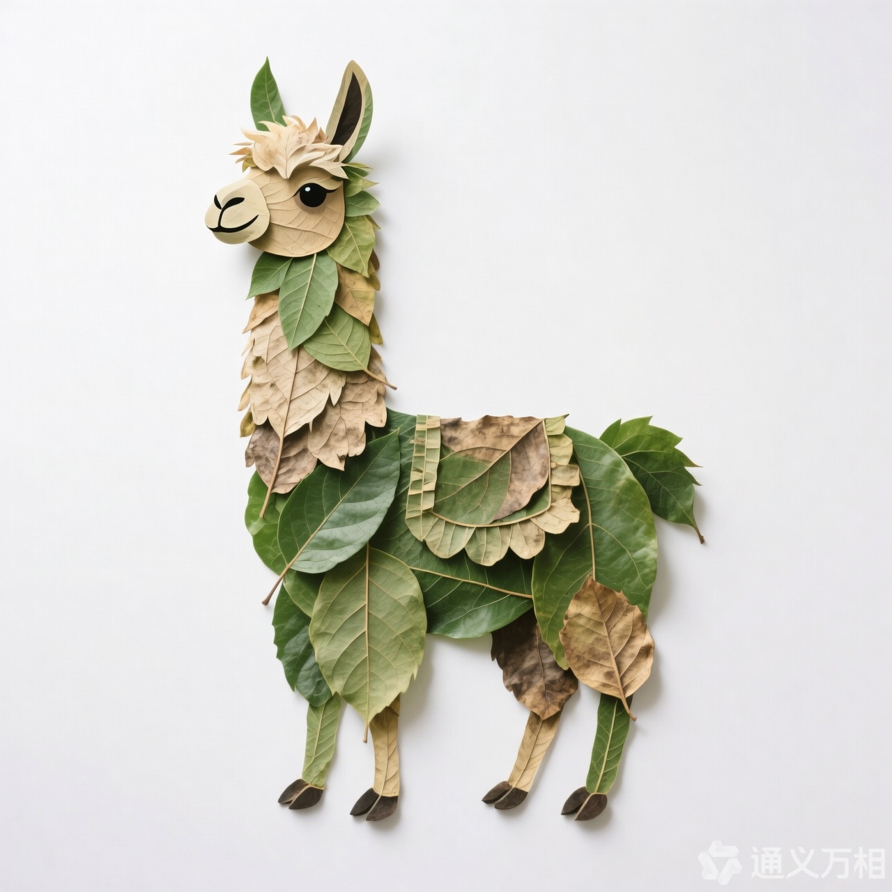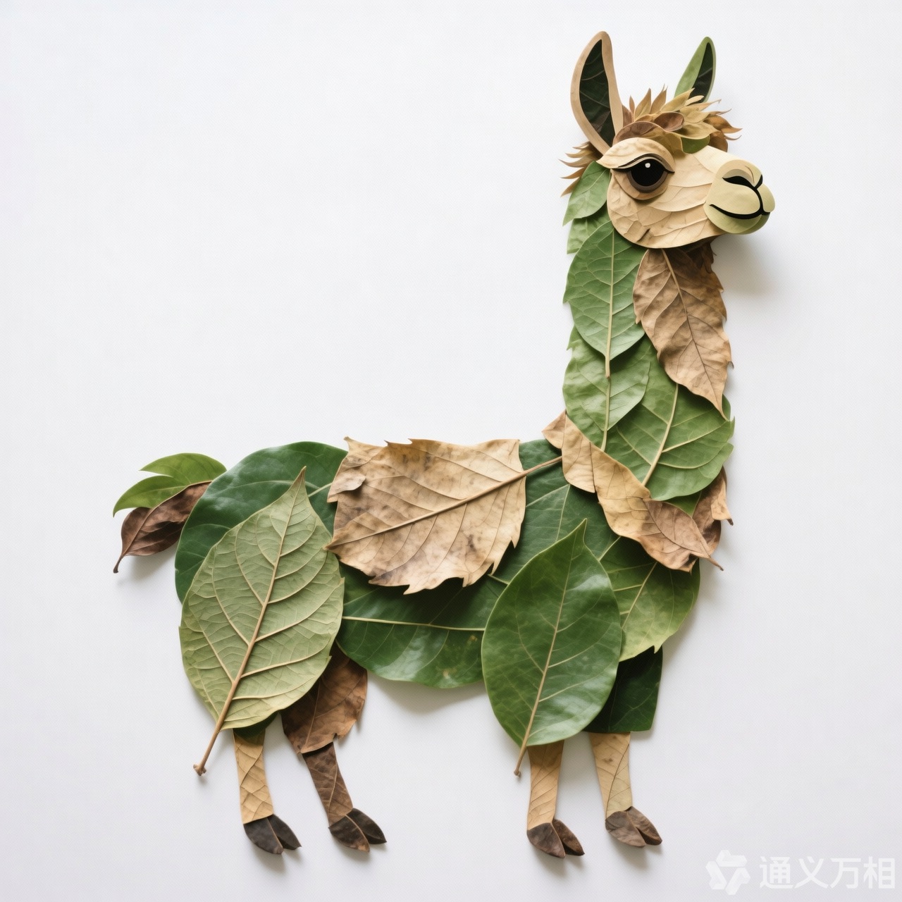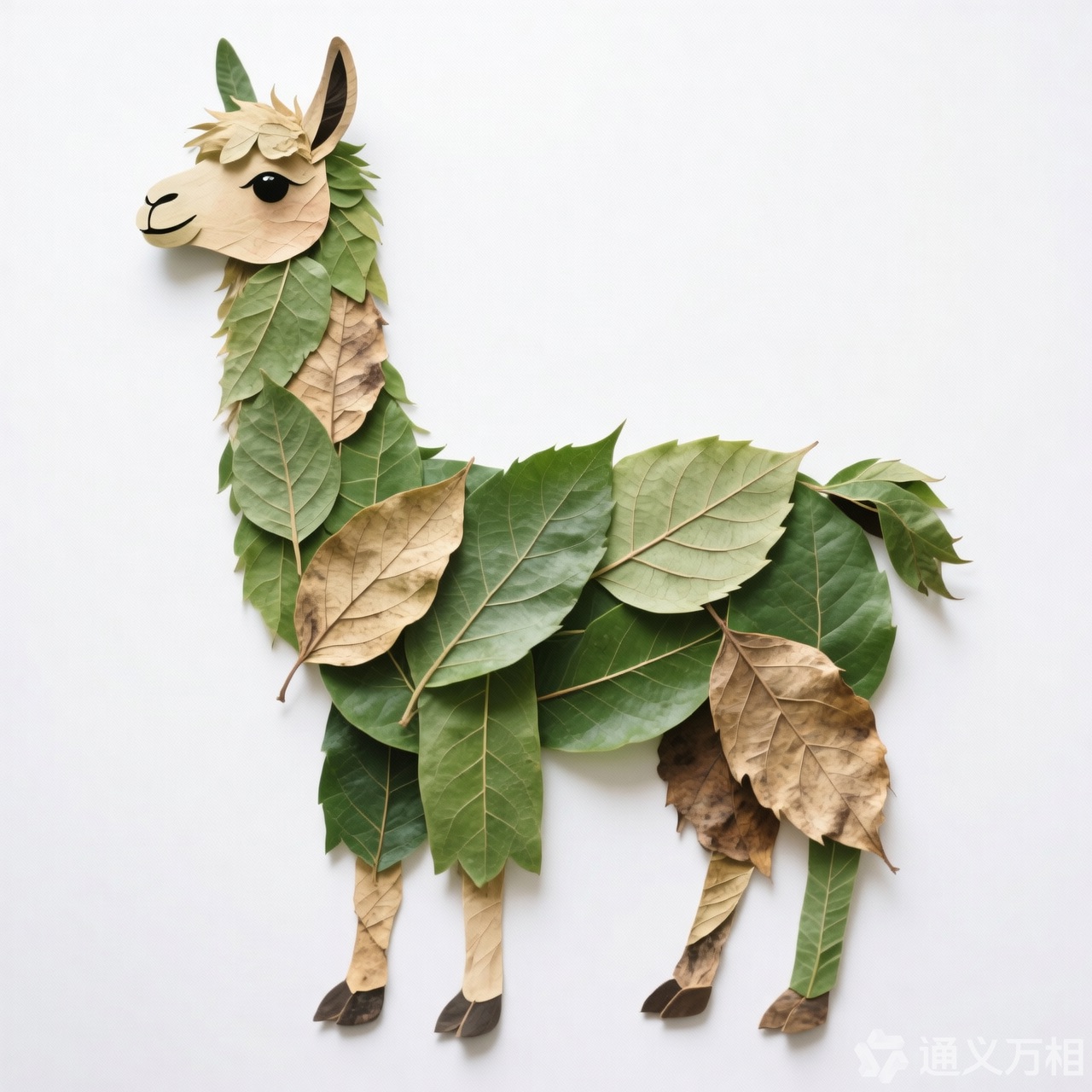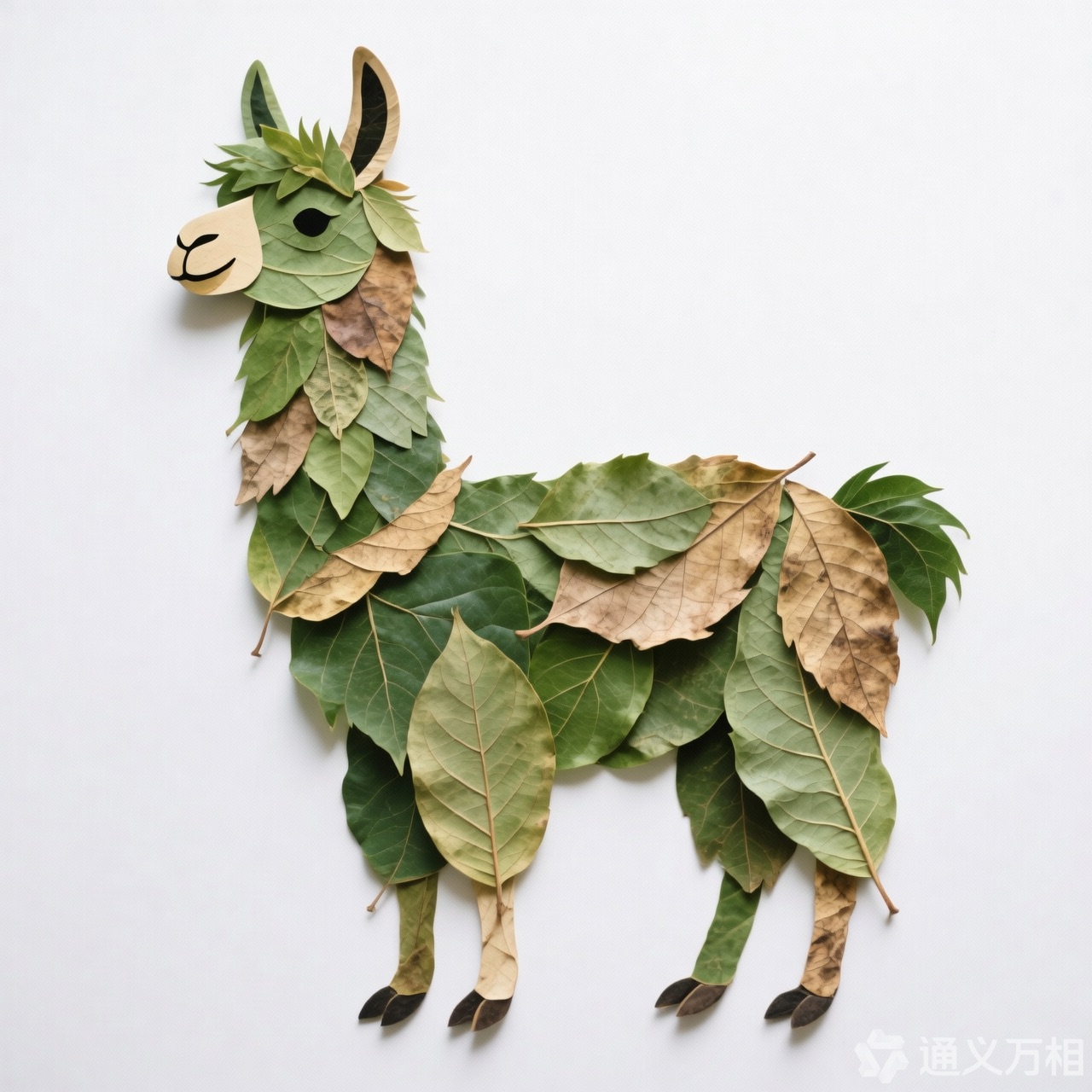 a llama made entirely from natural leaves, creative leaf collage art, layered green and dry leaves forming body, face and clothes, visible leaf veins and textures, handcrafted botanical art style, clean white background, top-down flat lay composition, highly detailed, soft natural lighting, realistic leaf textures, 8k