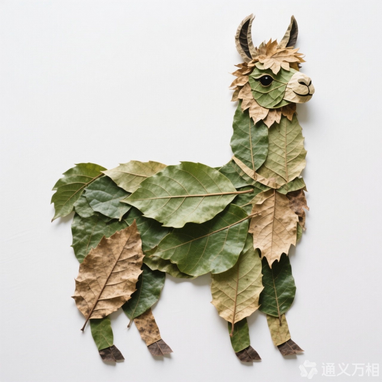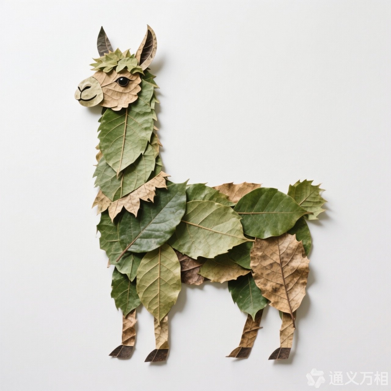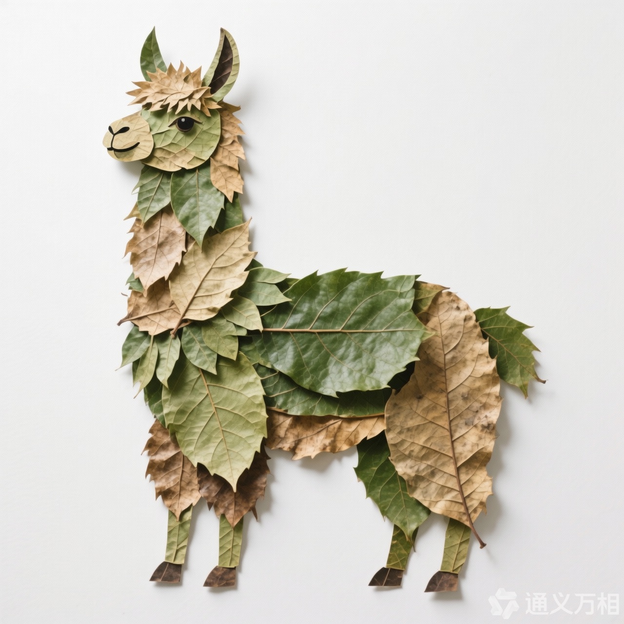 a llama made entirely from natural leaves, creative leaf collage art, layered green and dry leaves forming body, face and clothes, visible leaf veins and textures, handcrafted botanical art style, clean white background, top-down flat lay composition, highly detailed, soft natural lighting, realistic leaf textures, 8k