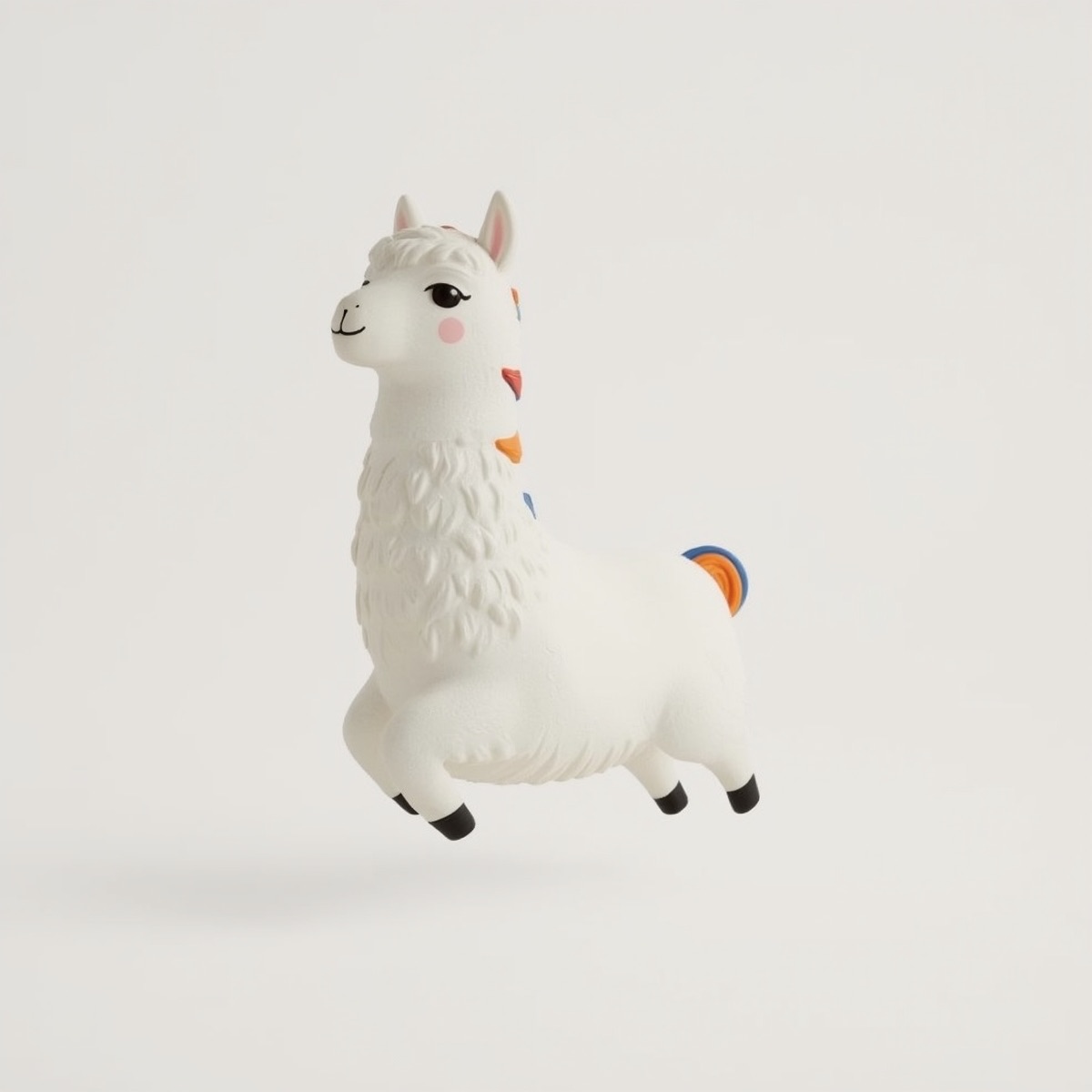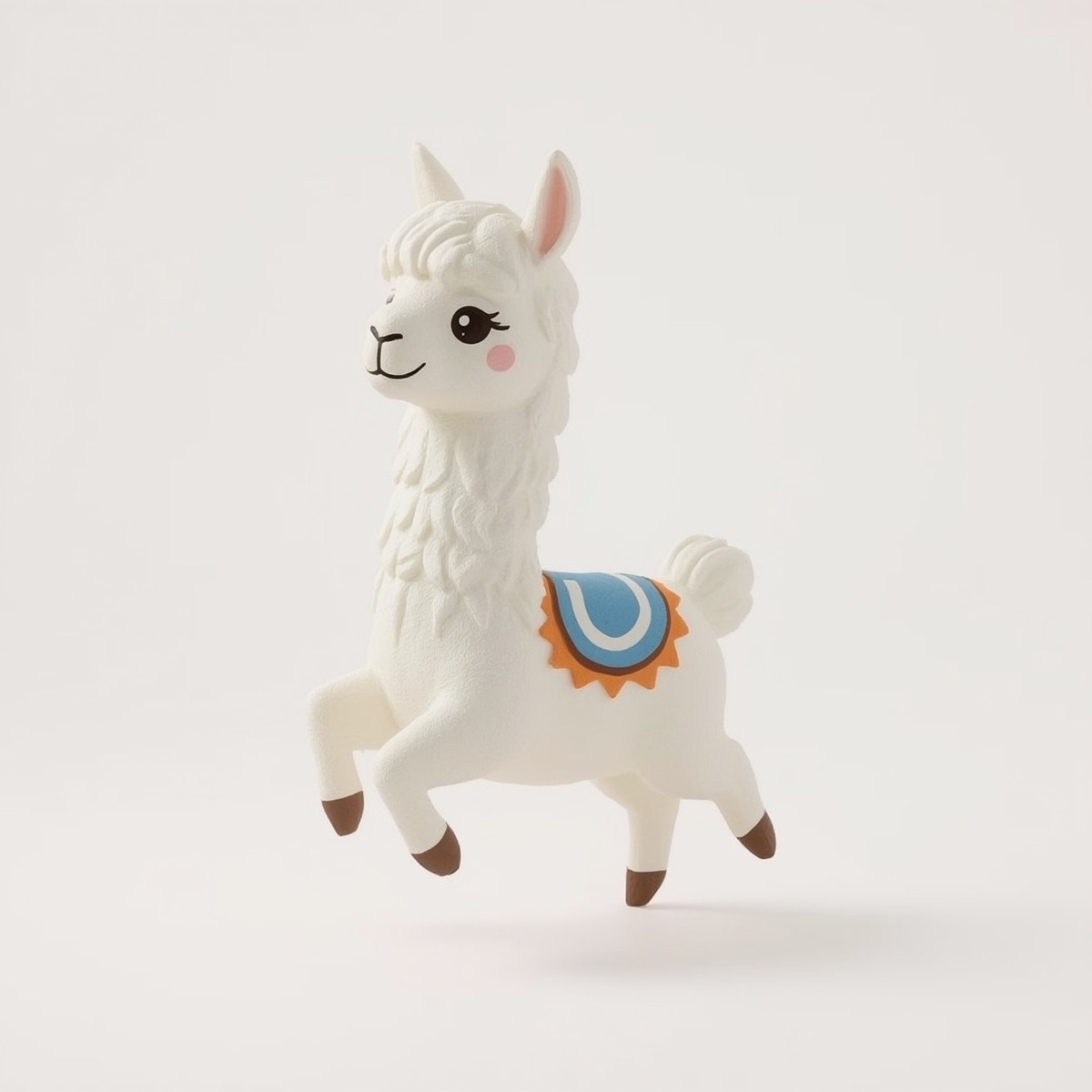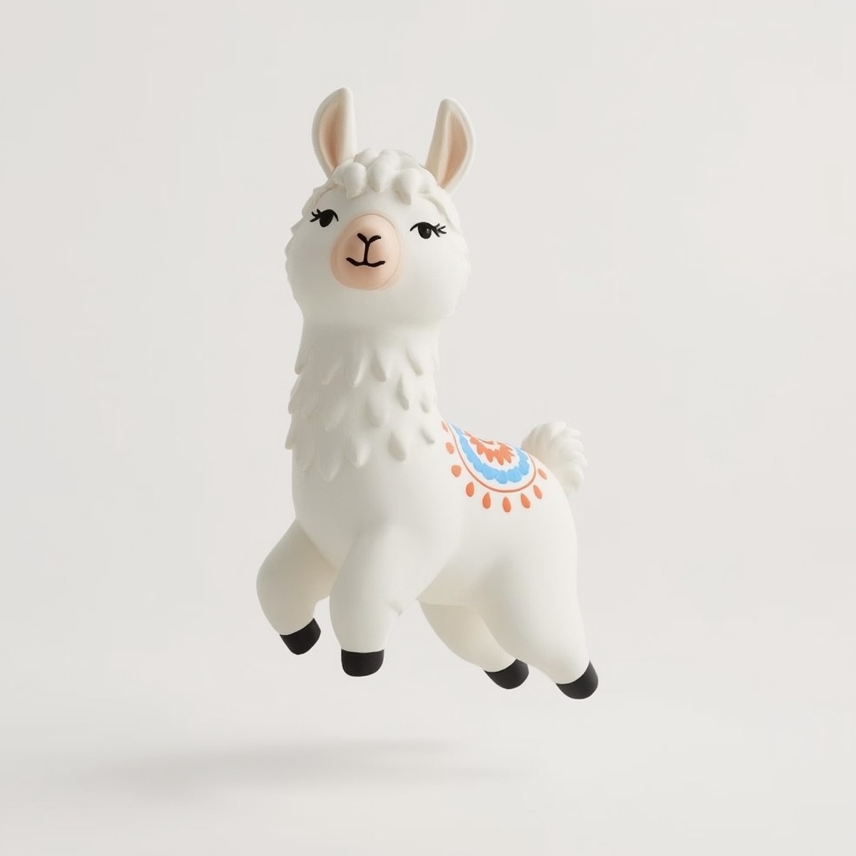 Cute 3D render of a llama , matte surface, kneaded clay icon style, simple stylized design, jumping, smile, rounded proportions, soft sculpted details, playful body language, vibrant blue, orange and white accents, clean white background, minimal composition, soft ambient lighting, subtle shadow, charming character design, high-resolution, polished toy-like aesthetic
