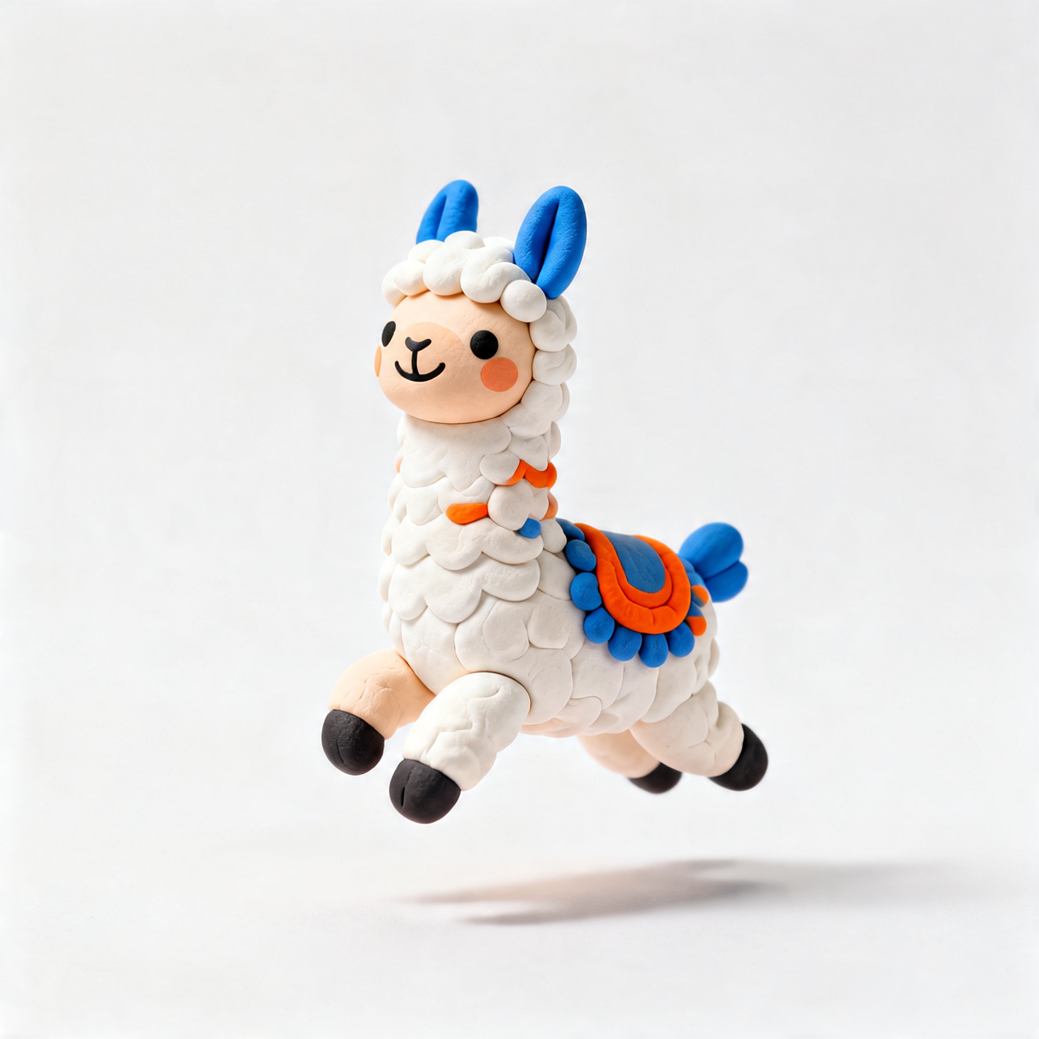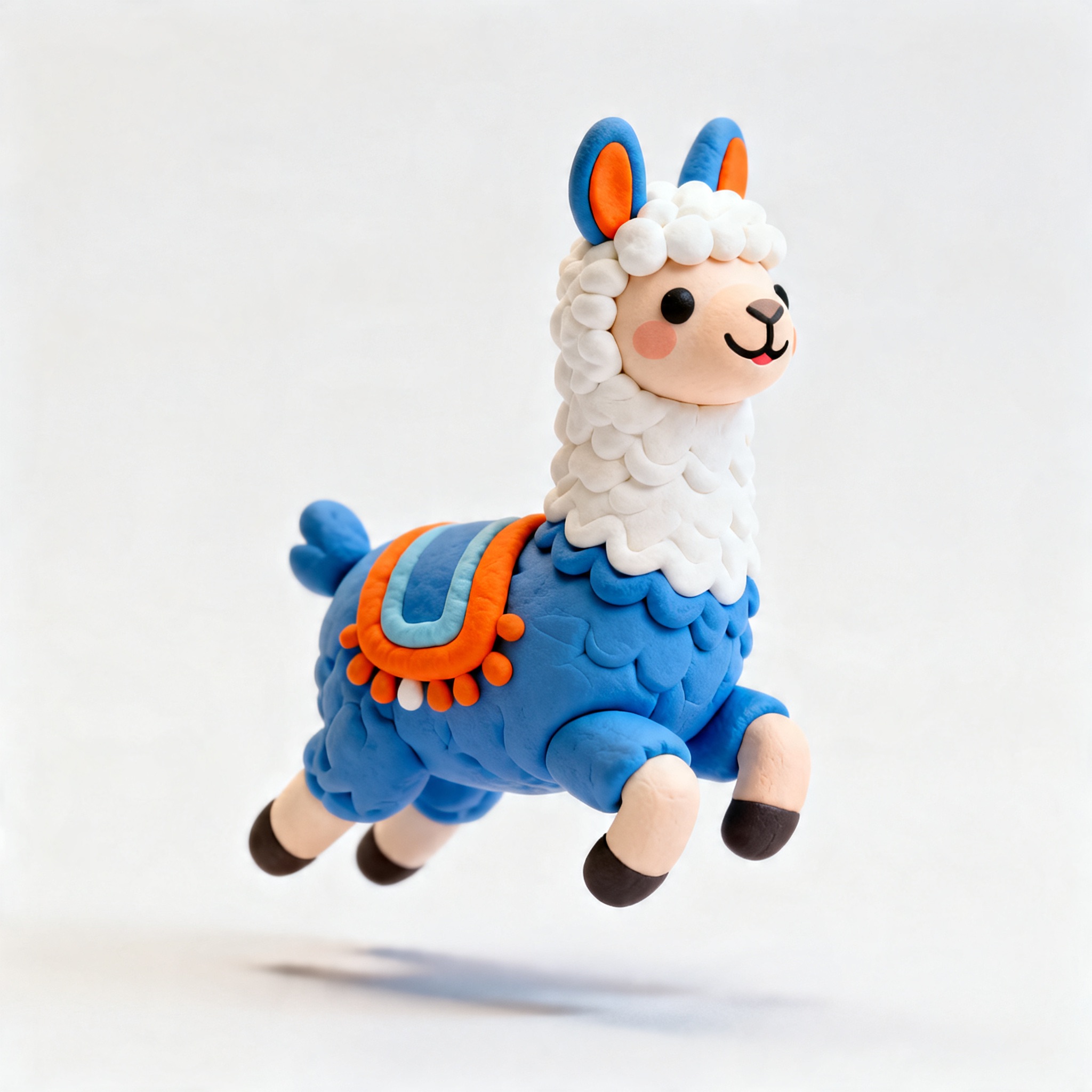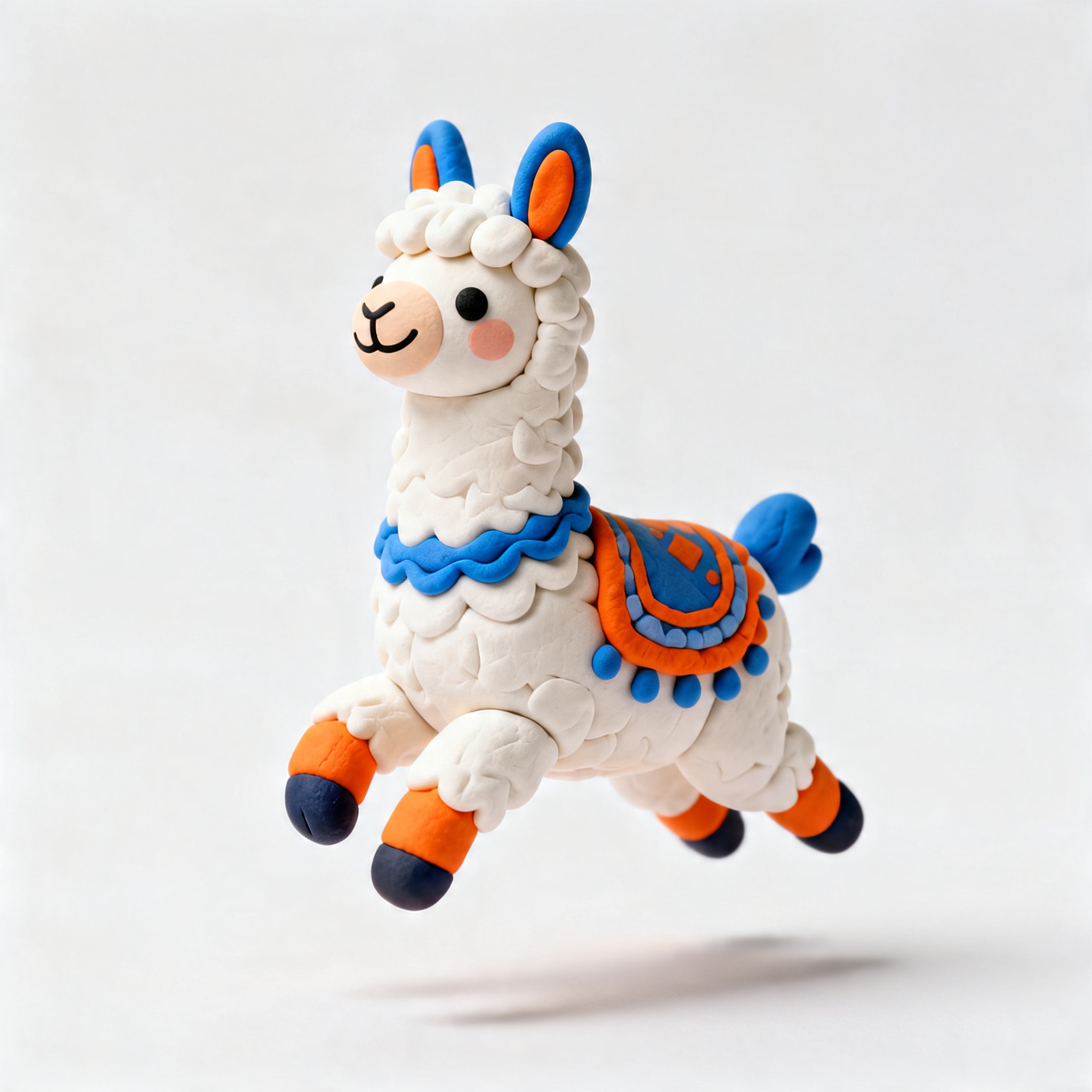 Cute 3D render of a llama , matte surface, kneaded clay icon style, simple stylized design, jumping, smile, rounded proportions, soft sculpted details, playful body language, vibrant blue, orange and white accents, clean white background, minimal composition, soft ambient lighting, subtle shadow, charming character design, high-resolution, polished toy-like aesthetic