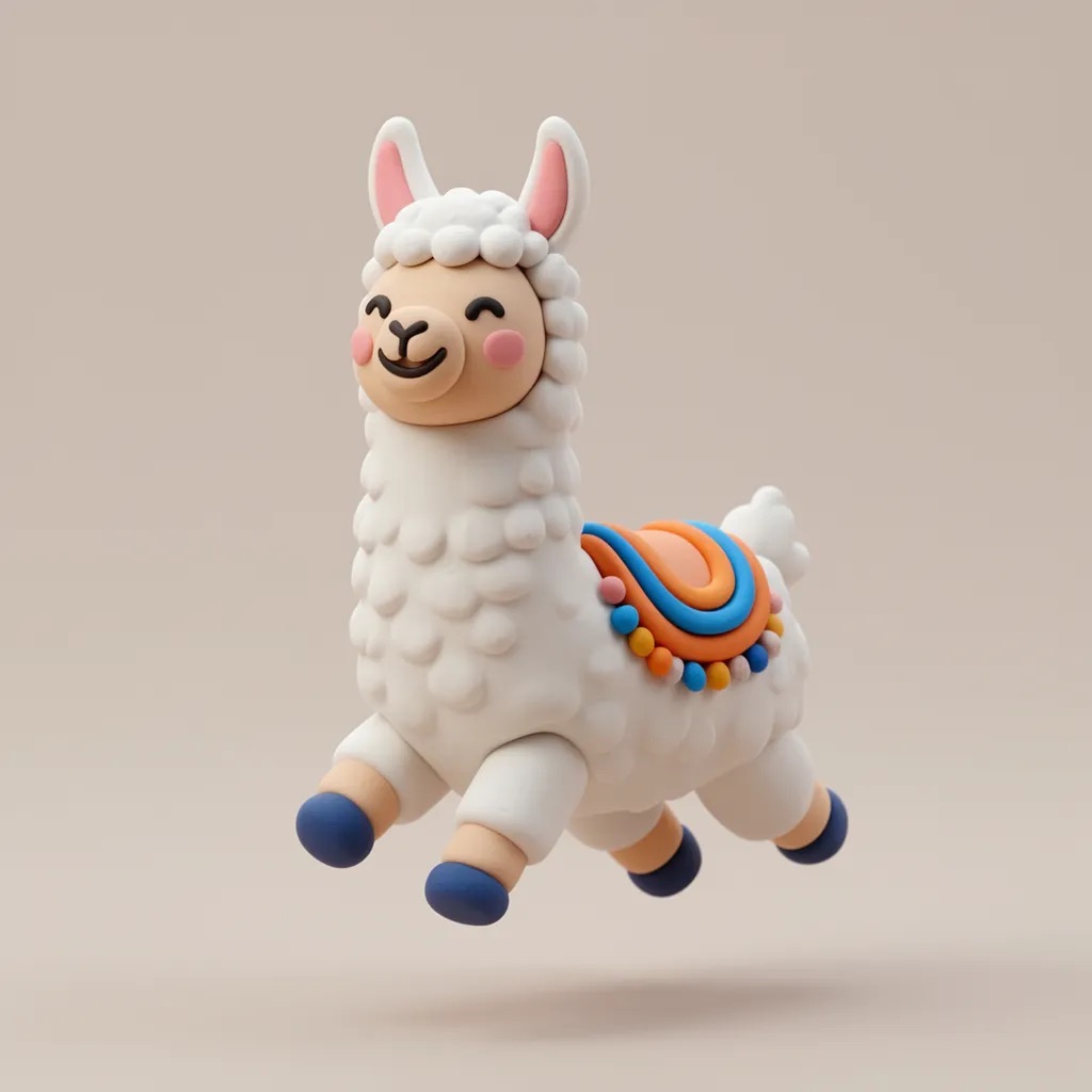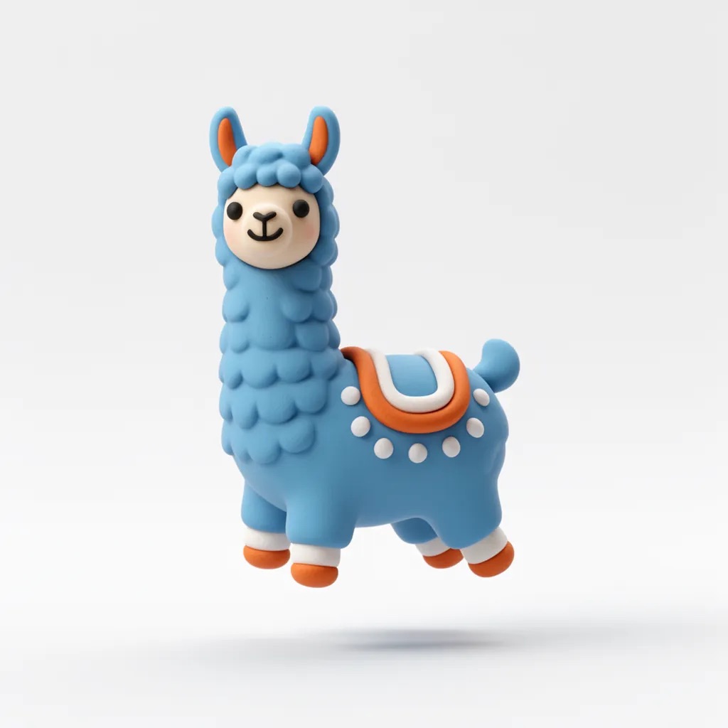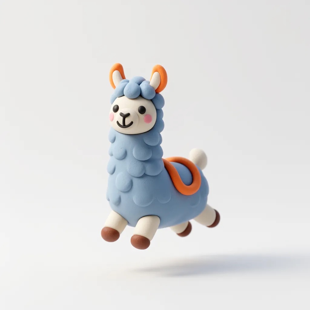 Cute 3D render of a llama , matte surface, kneaded clay icon style, simple stylized design, jumping, smile, rounded proportions, soft sculpted details, playful body language, vibrant blue, orange and white accents, clean white background, minimal composition, soft ambient lighting, subtle shadow, charming character design, high-resolution, polished toy-like aesthetic
