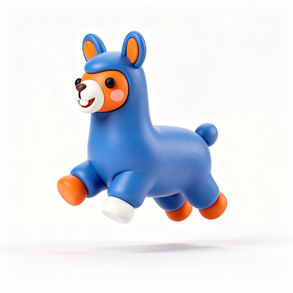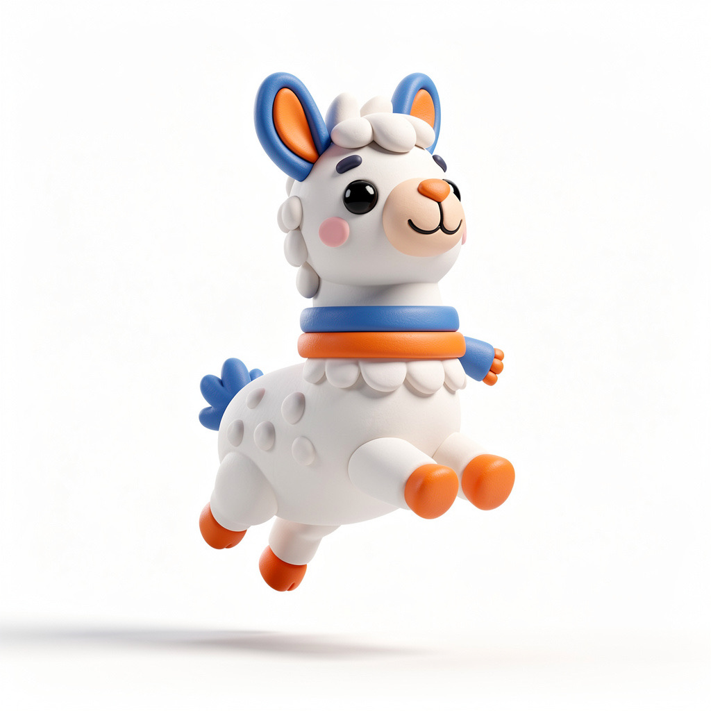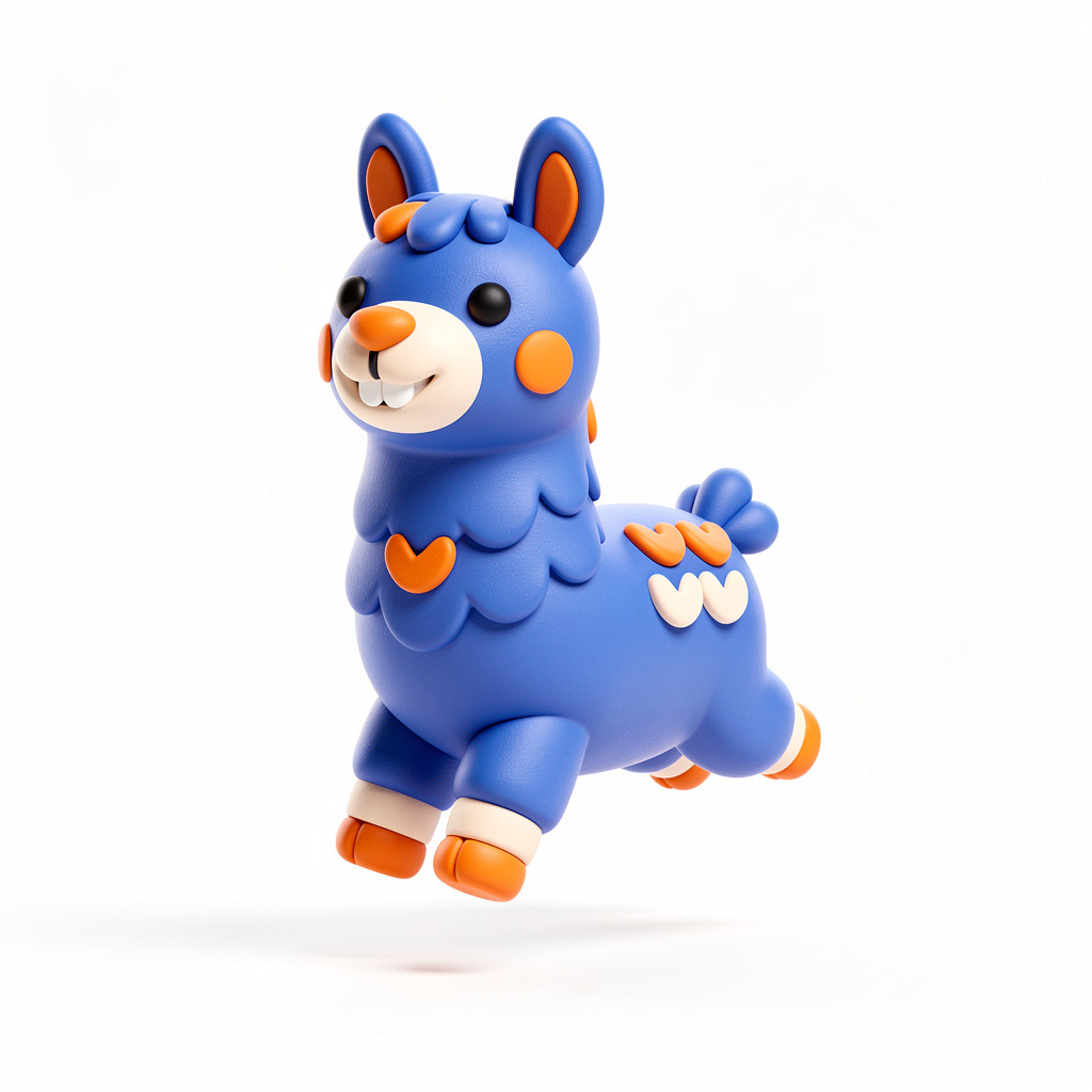 Cute 3D render of a llama , matte surface, kneaded clay icon style, simple stylized design, jumping, smile, rounded proportions, soft sculpted details, playful body language, vibrant blue, orange and white accents, clean white background, minimal composition, soft ambient lighting, subtle shadow, charming character design, high-resolution, polished toy-like aesthetic