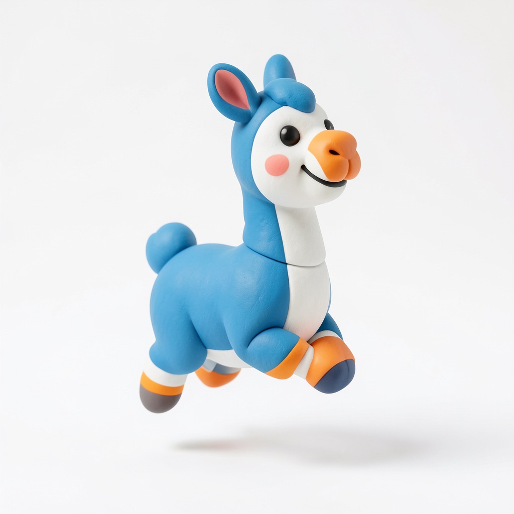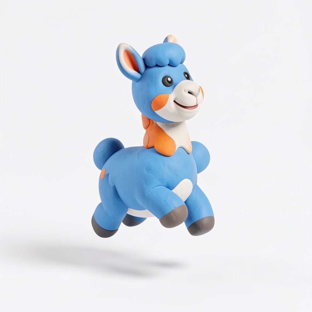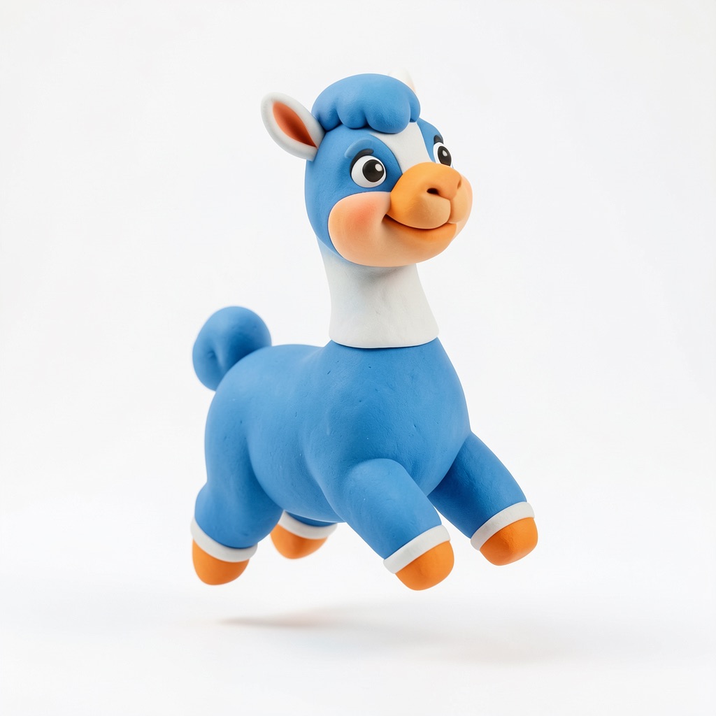 Cute 3D render of a llama , matte surface, kneaded clay icon style, simple stylized design, jumping, smile, rounded proportions, soft sculpted details, playful body language, vibrant blue, orange and white accents, clean white background, minimal composition, soft ambient lighting, subtle shadow, charming character design, high-resolution, polished toy-like aesthetic