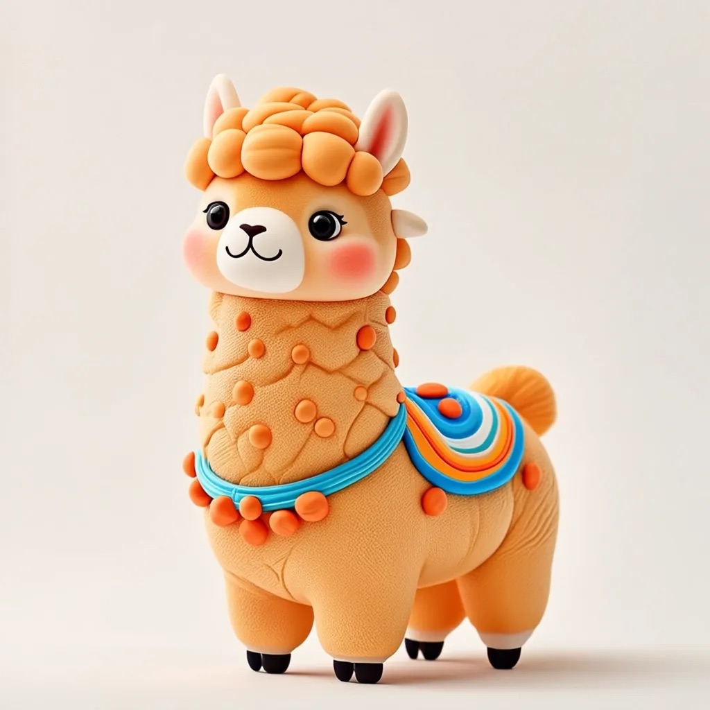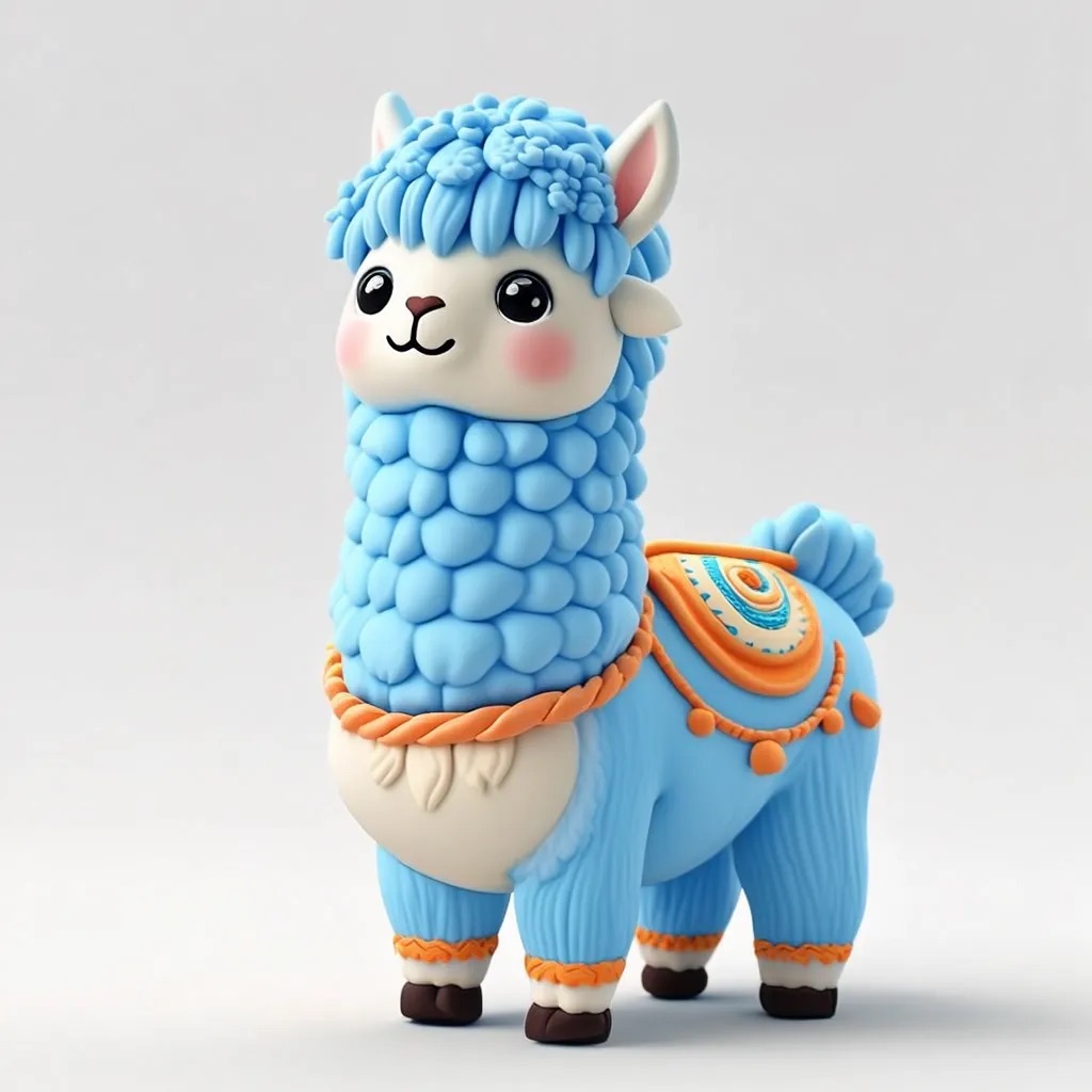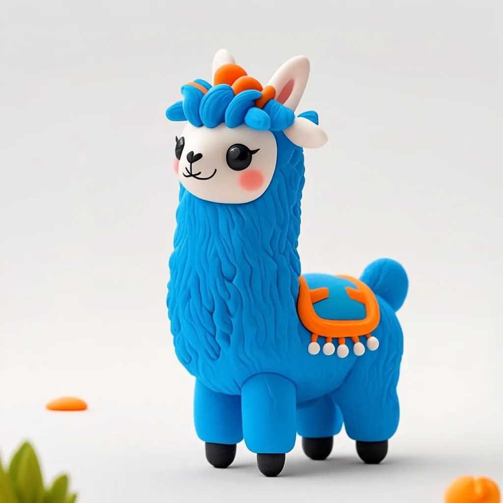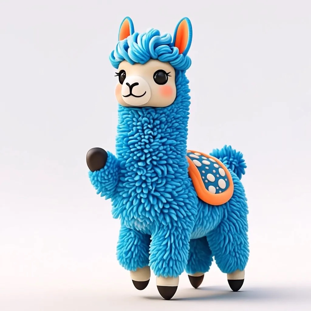 Cute 3D render of a llama , matte surface, kneaded clay icon style, simple stylized design, jumping, smile, rounded proportions, soft sculpted details, playful body language, vibrant blue, orange and white accents, clean white background, minimal composition, soft ambient lighting, subtle shadow, charming character design, high-resolution, polished toy-like aesthetic