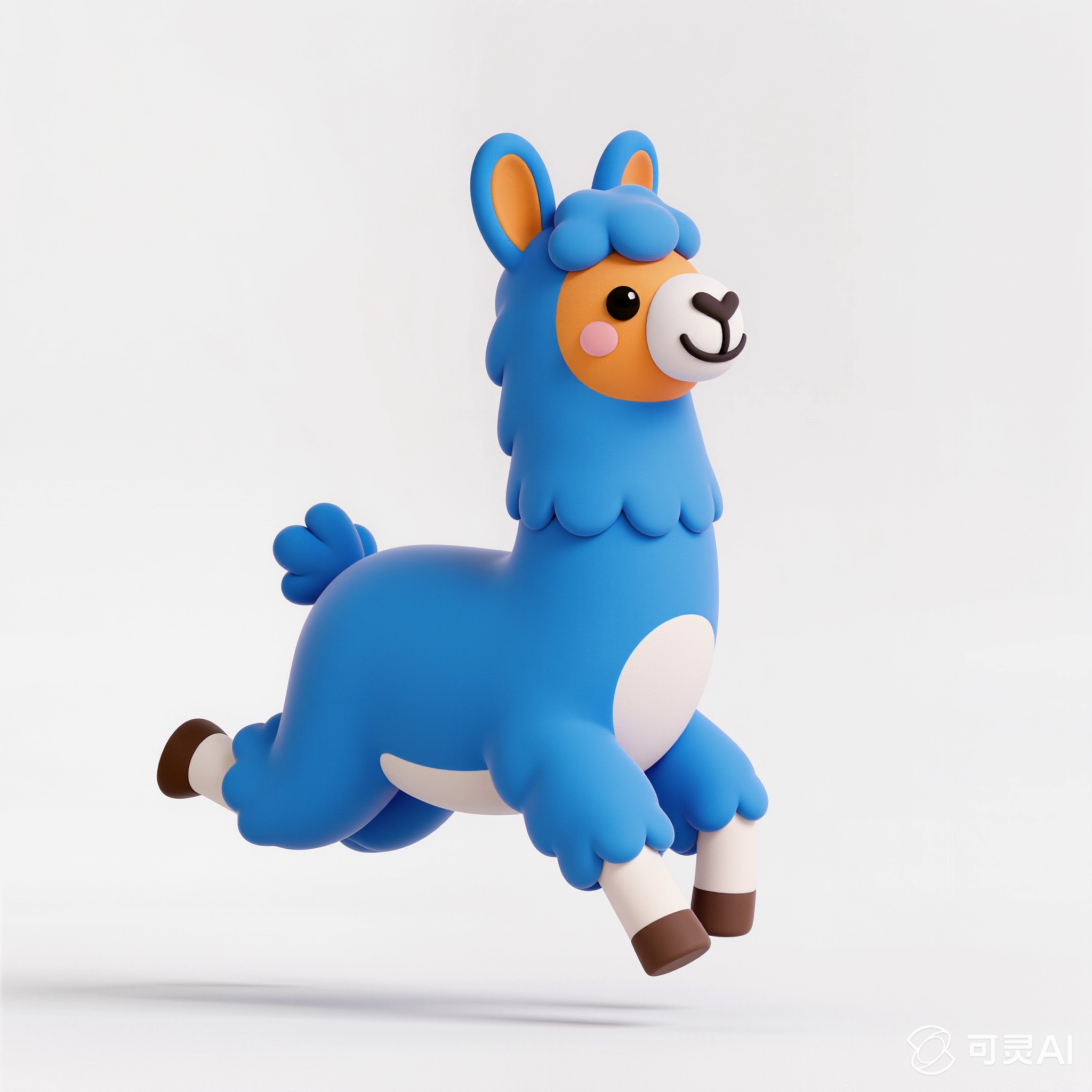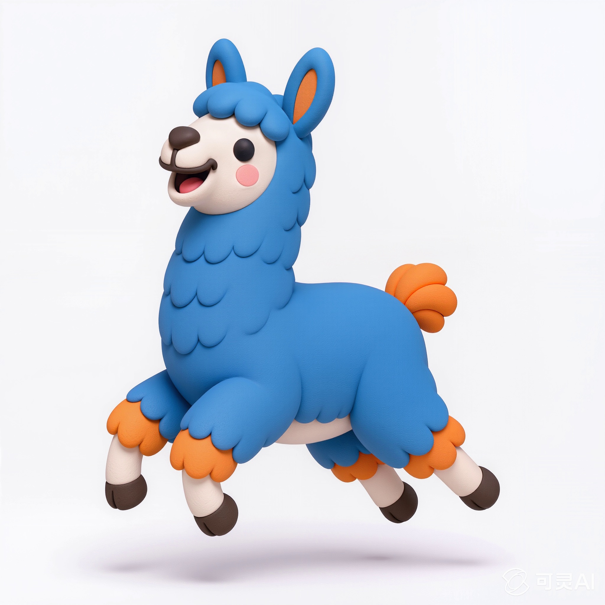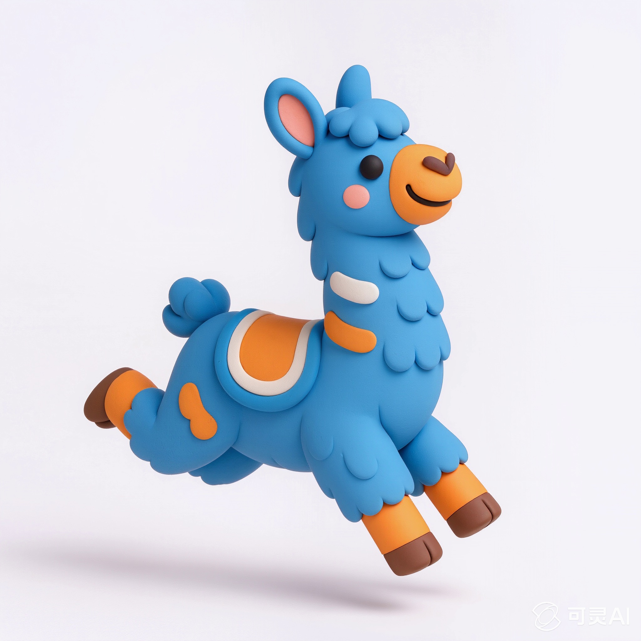 Cute 3D render of a llama , matte surface, kneaded clay icon style, simple stylized design, jumping, smile, rounded proportions, soft sculpted details, playful body language, vibrant blue, orange and white accents, clean white background, minimal composition, soft ambient lighting, subtle shadow, charming character design, high-resolution, polished toy-like aesthetic