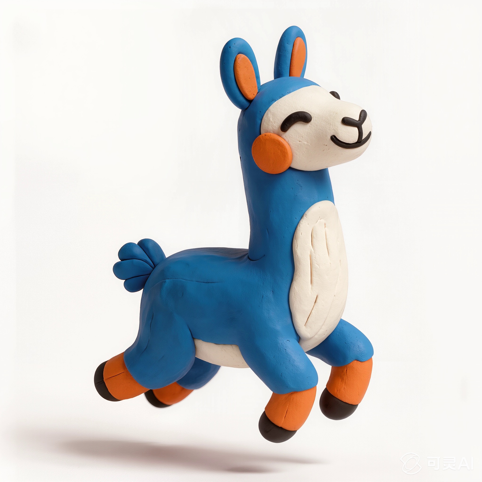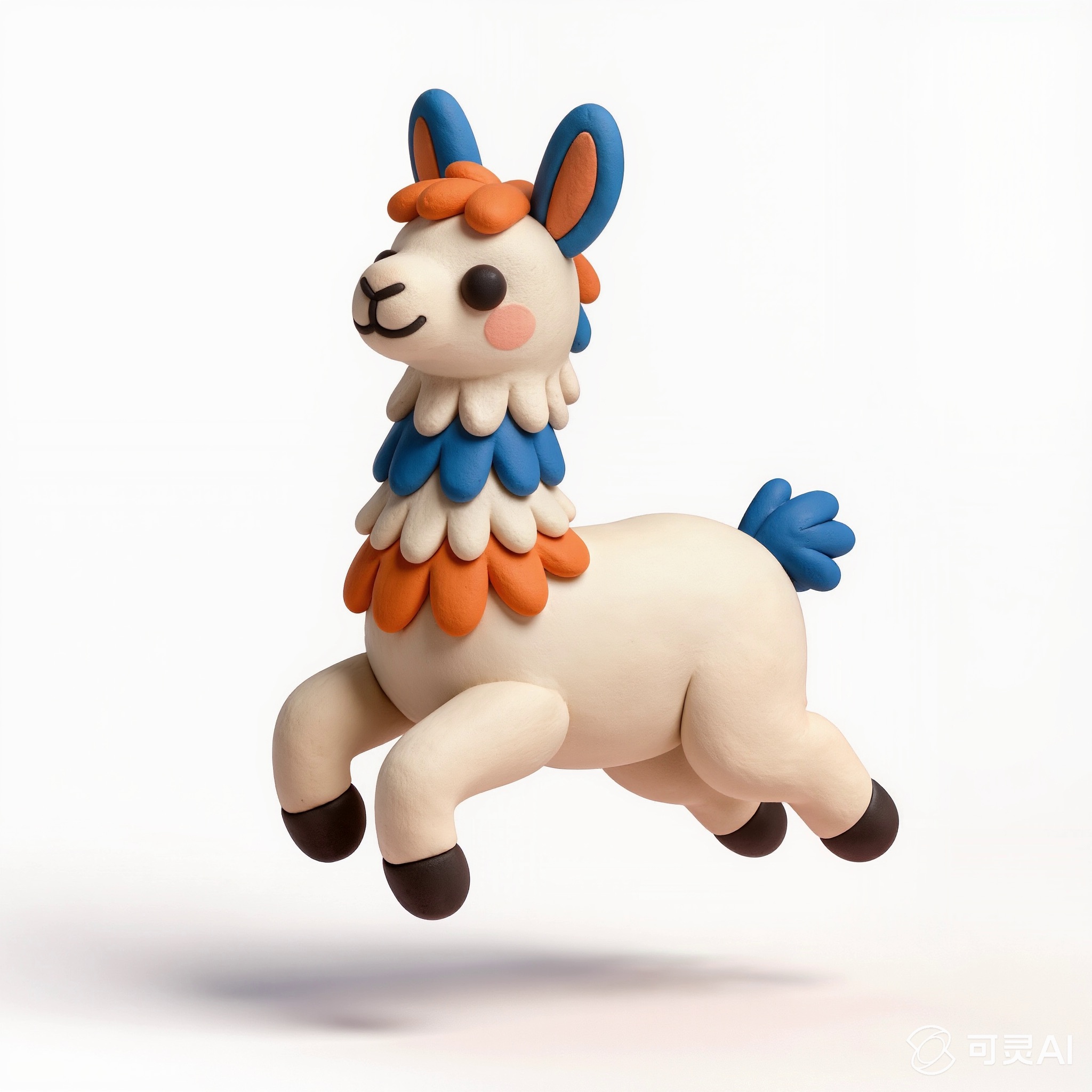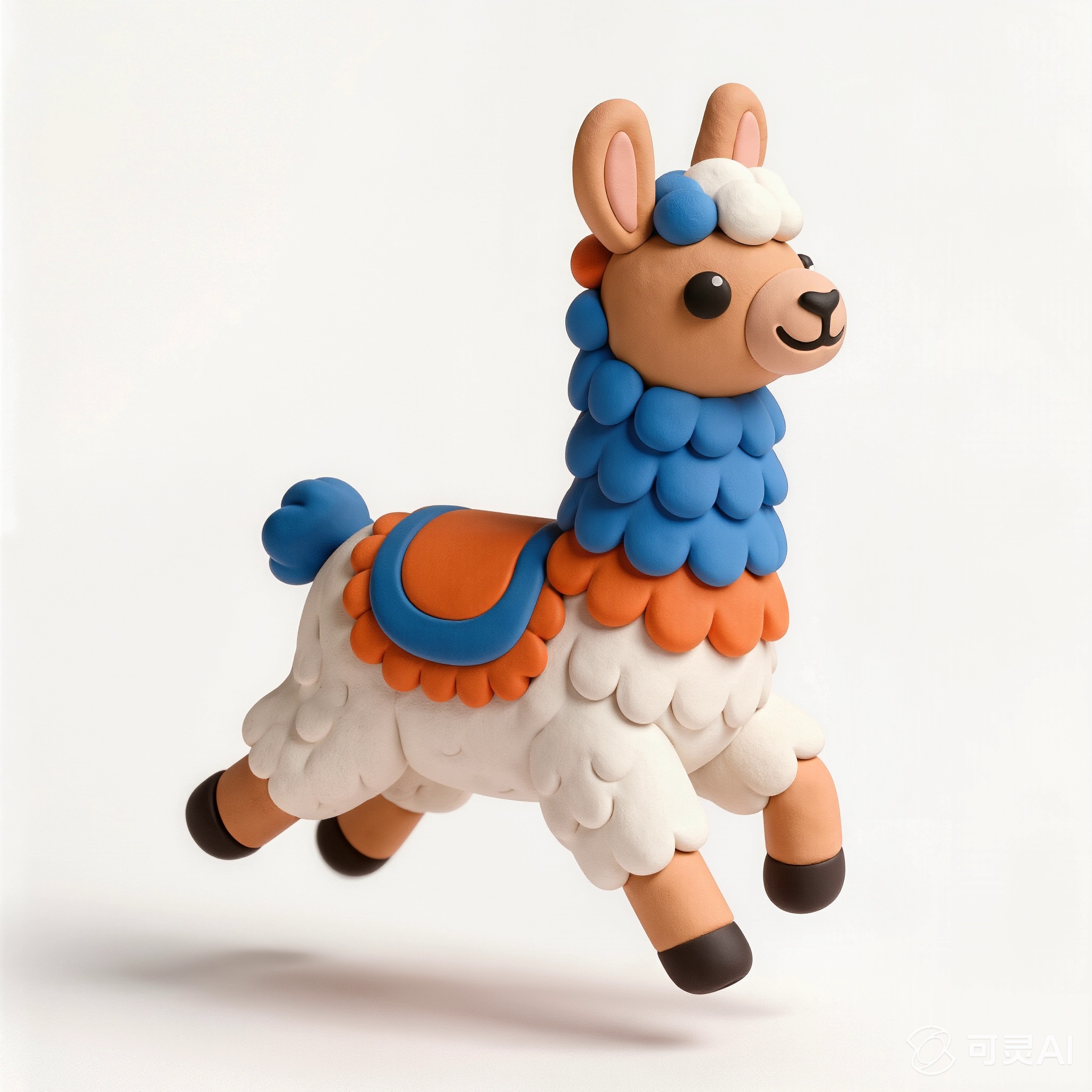 Cute 3D render of a llama , matte surface, kneaded clay icon style, simple stylized design, jumping, smile, rounded proportions, soft sculpted details, playful body language, vibrant blue, orange and white accents, clean white background, minimal composition, soft ambient lighting, subtle shadow, charming character design, high-resolution, polished toy-like aesthetic