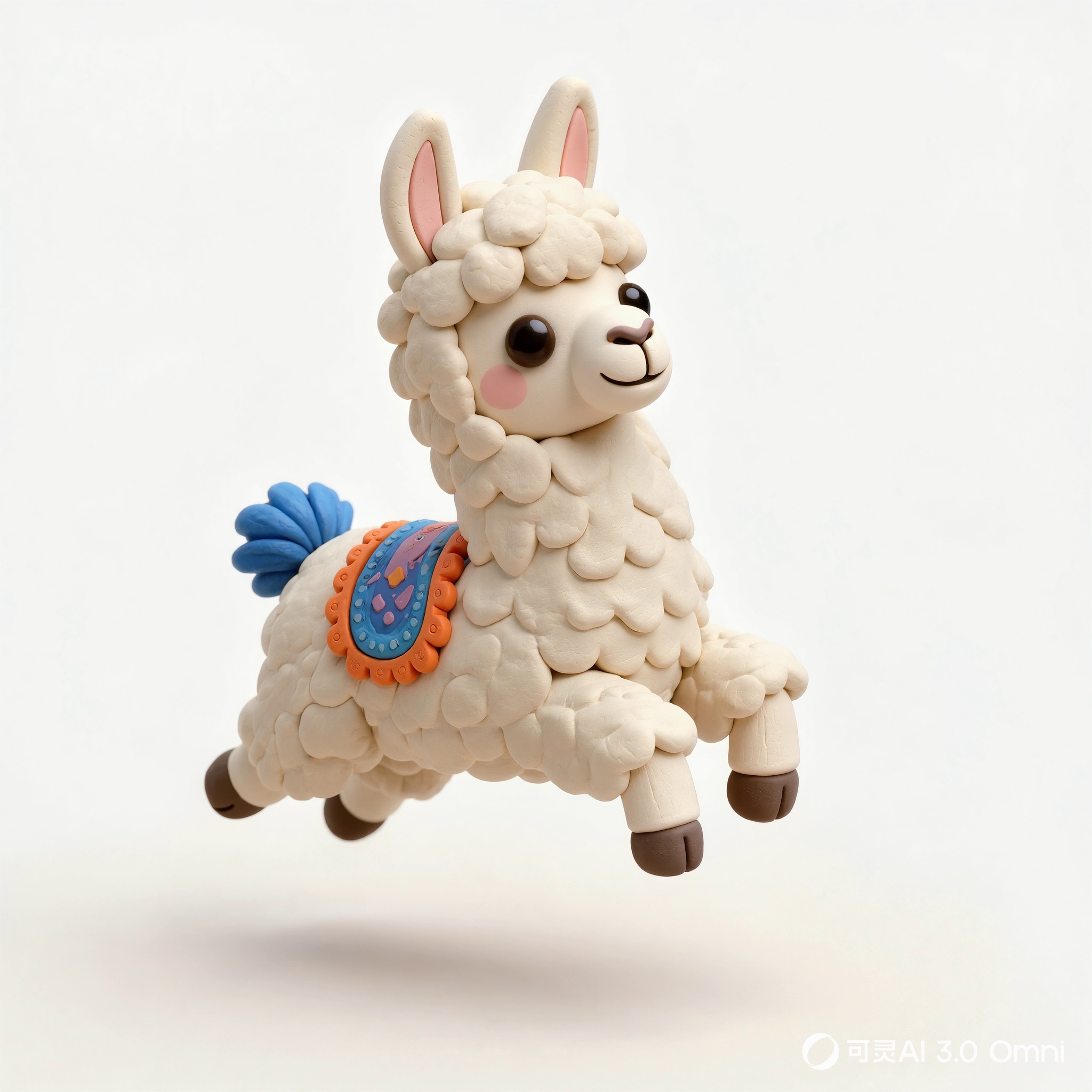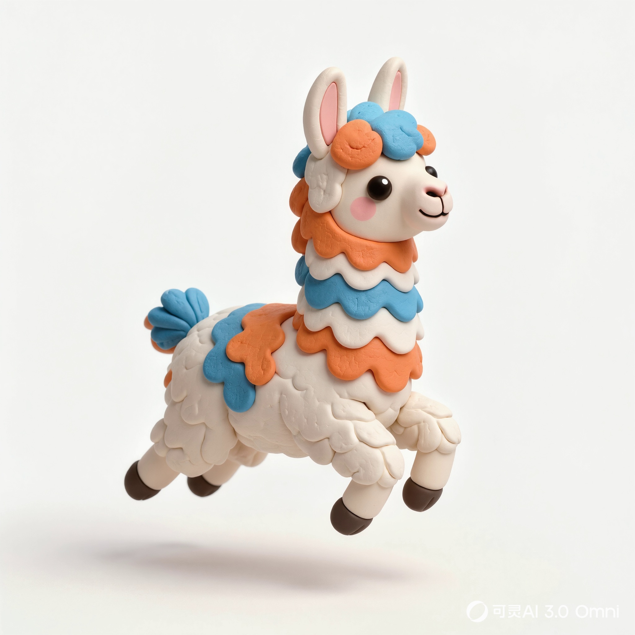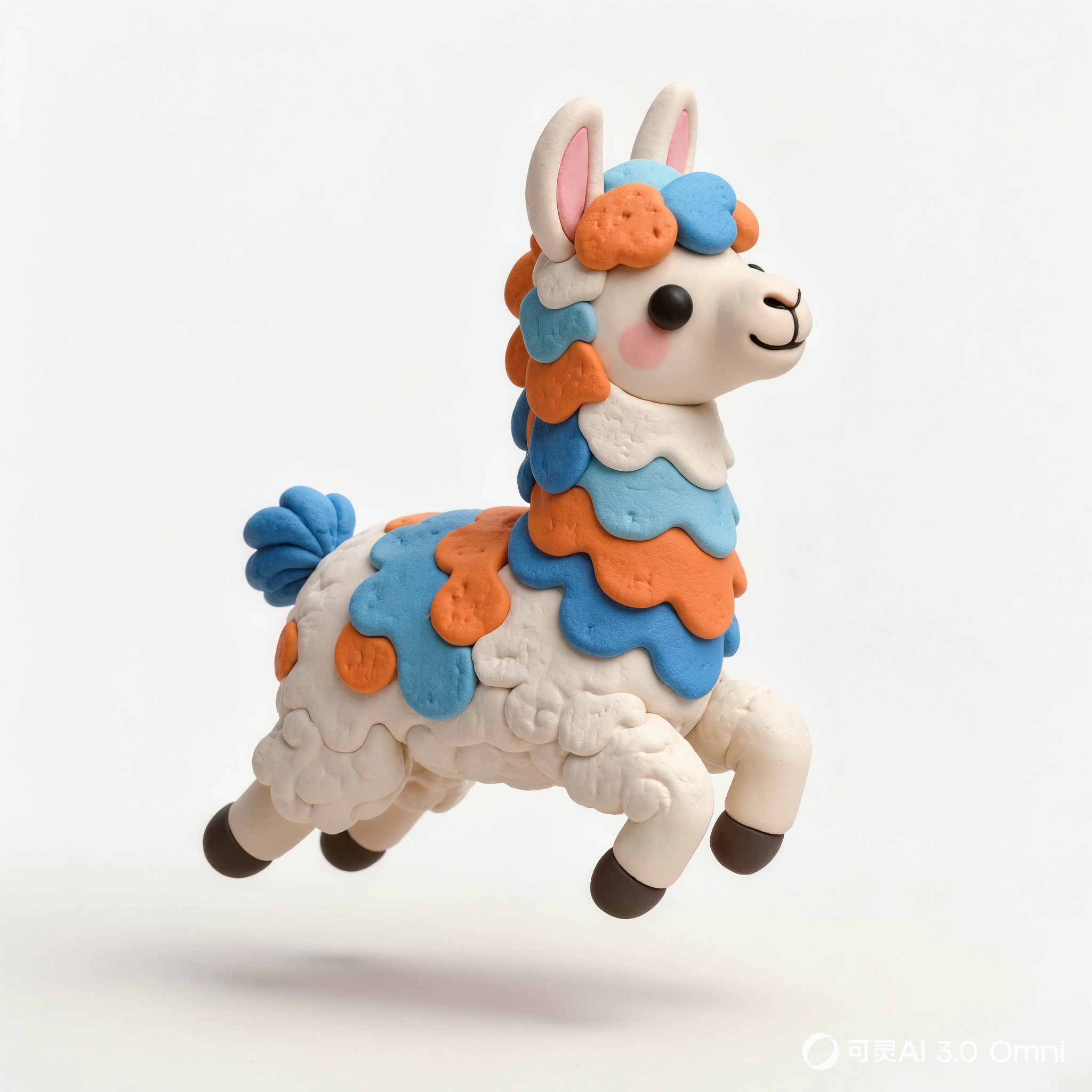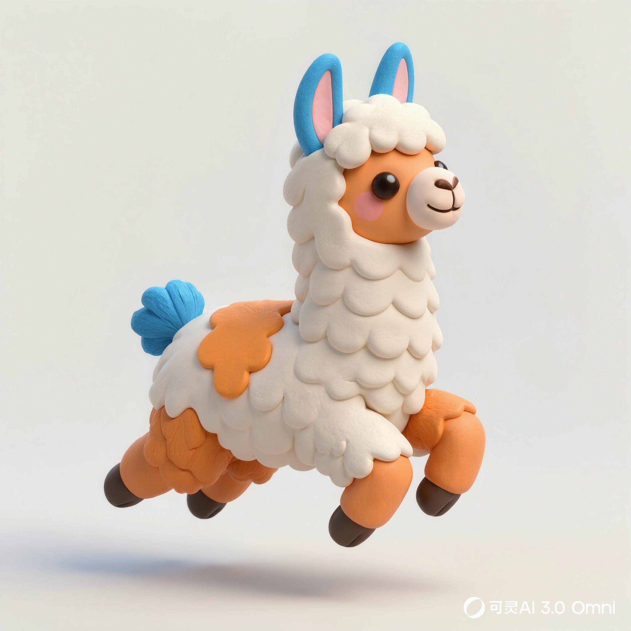 Cute 3D render of a llama , matte surface, kneaded clay icon style, simple stylized design, jumping, smile, rounded proportions, soft sculpted details, playful body language, vibrant blue, orange and white accents, clean white background, minimal composition, soft ambient lighting, subtle shadow, charming character design, high-resolution, polished toy-like aesthetic