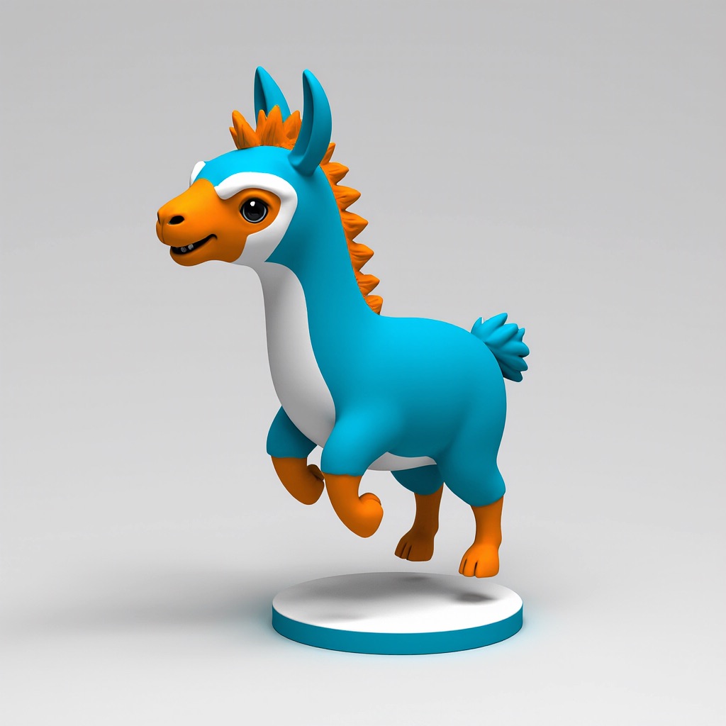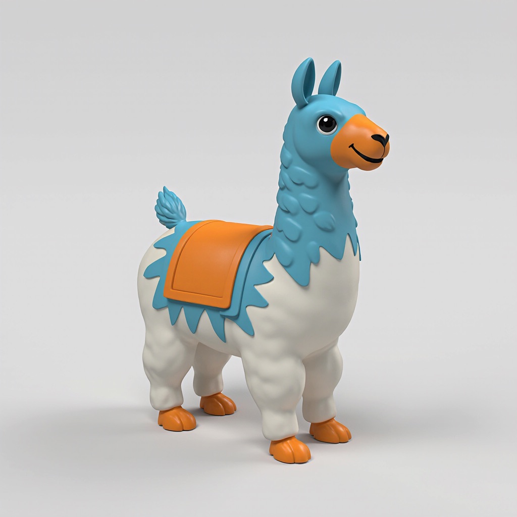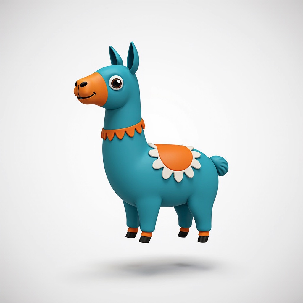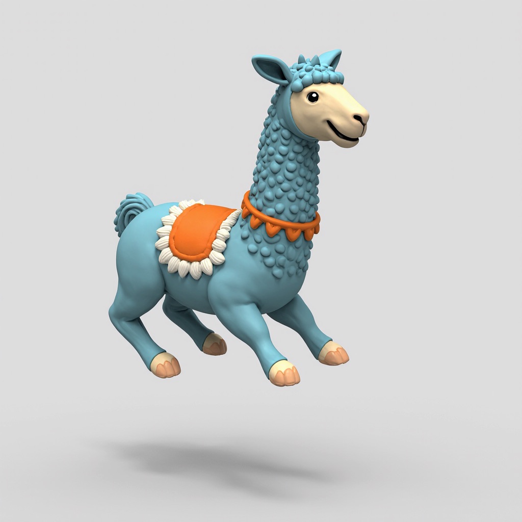 Cute 3D render of a llama , matte surface, kneaded clay icon style, simple stylized design, jumping, smile, rounded proportions, soft sculpted details, playful body language, vibrant blue, orange and white accents, clean white background, minimal composition, soft ambient lighting, subtle shadow, charming character design, high-resolution, polished toy-like aesthetic