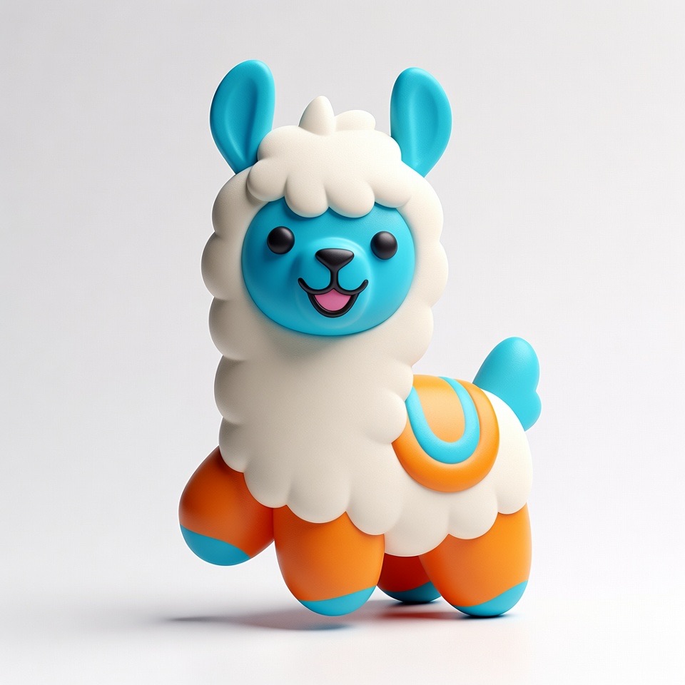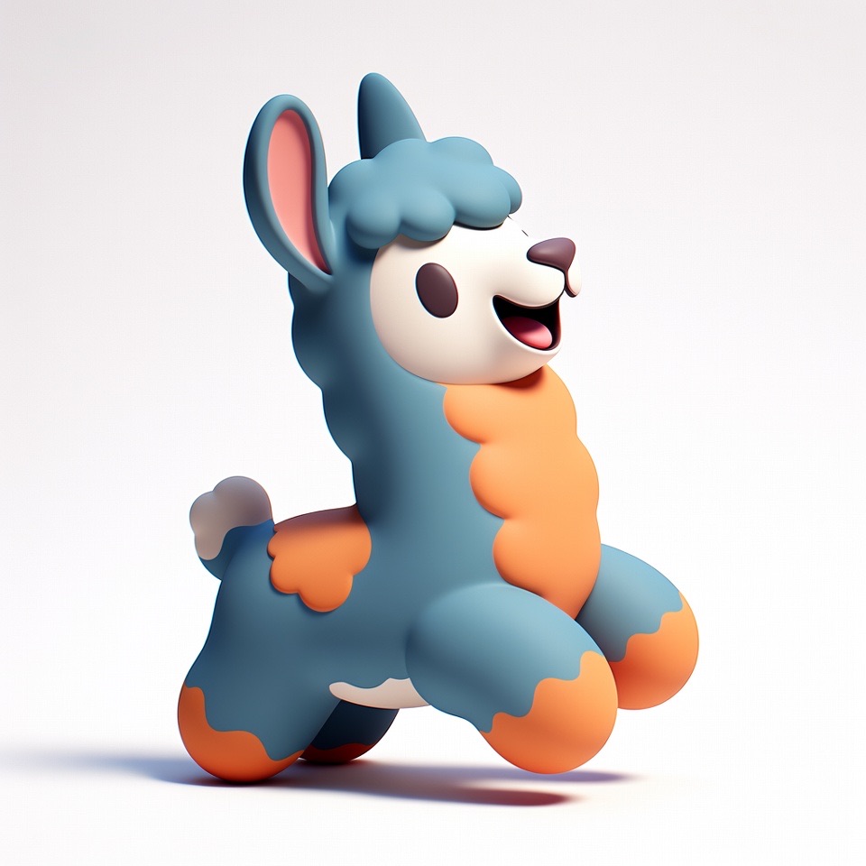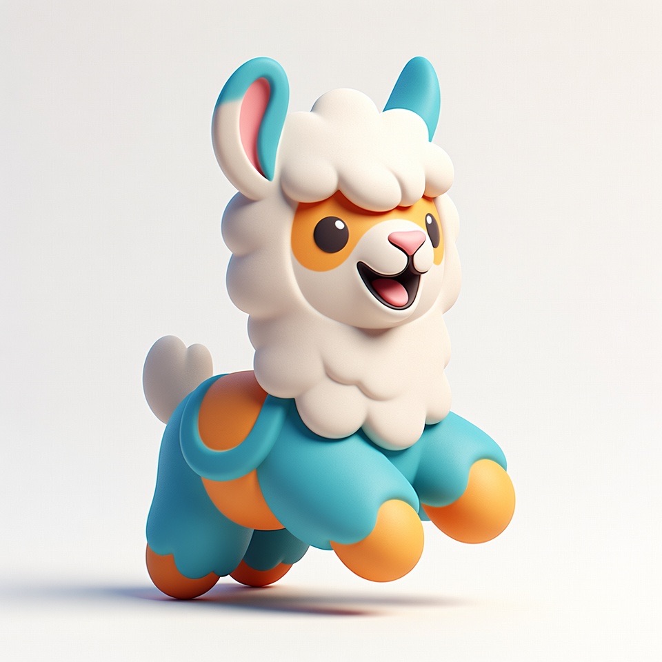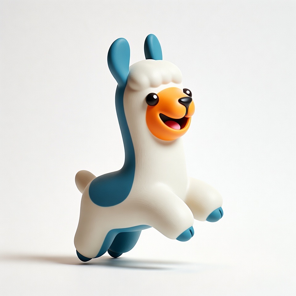 Cute 3D render of a llama , matte surface, kneaded clay icon style, simple stylized design, jumping, smile, rounded proportions, soft sculpted details, playful body language, vibrant blue, orange and white accents, clean white background, minimal composition, soft ambient lighting, subtle shadow, charming character design, high-resolution, polished toy-like aesthetic