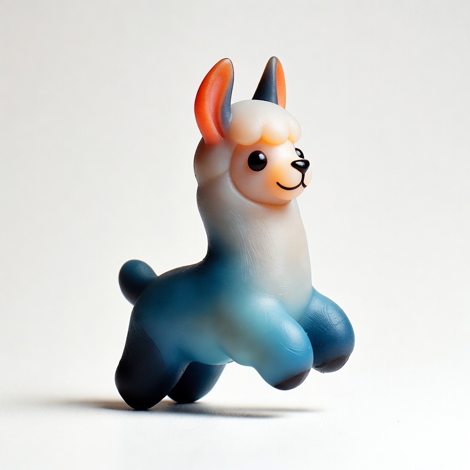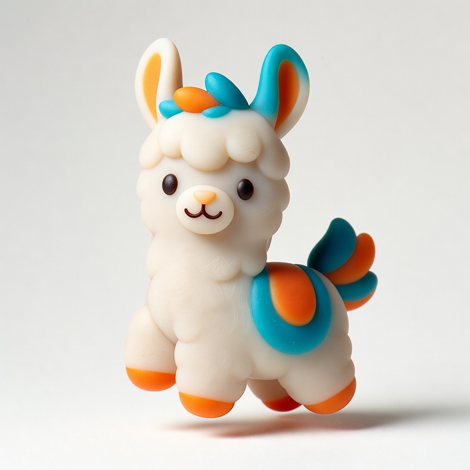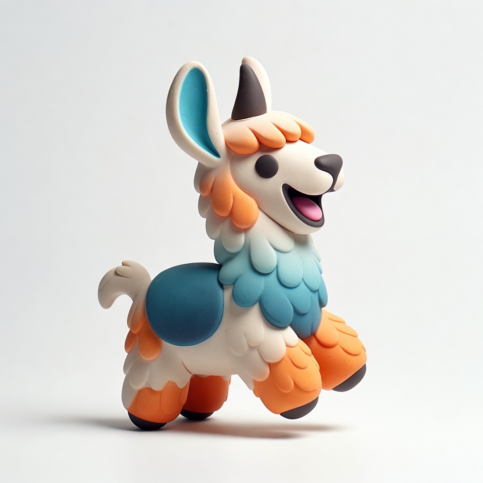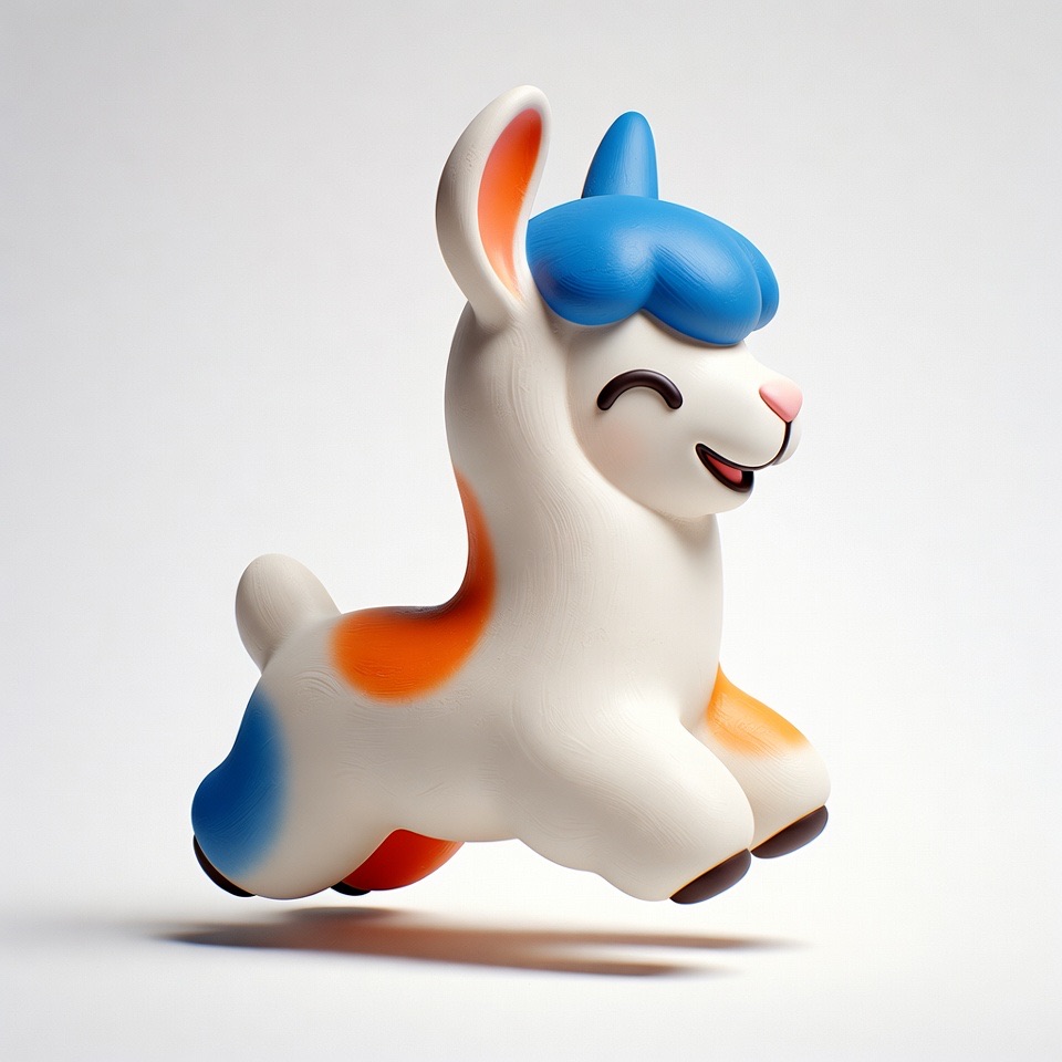 Cute 3D render of a llama , matte surface, kneaded clay icon style, simple stylized design, jumping, smile, rounded proportions, soft sculpted details, playful body language, vibrant blue, orange and white accents, clean white background, minimal composition, soft ambient lighting, subtle shadow, charming character design, high-resolution, polished toy-like aesthetic