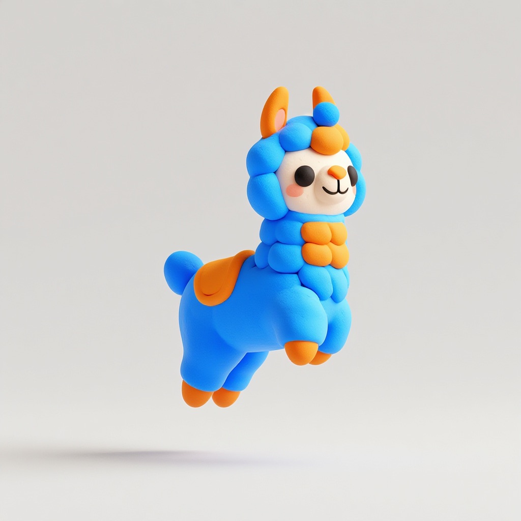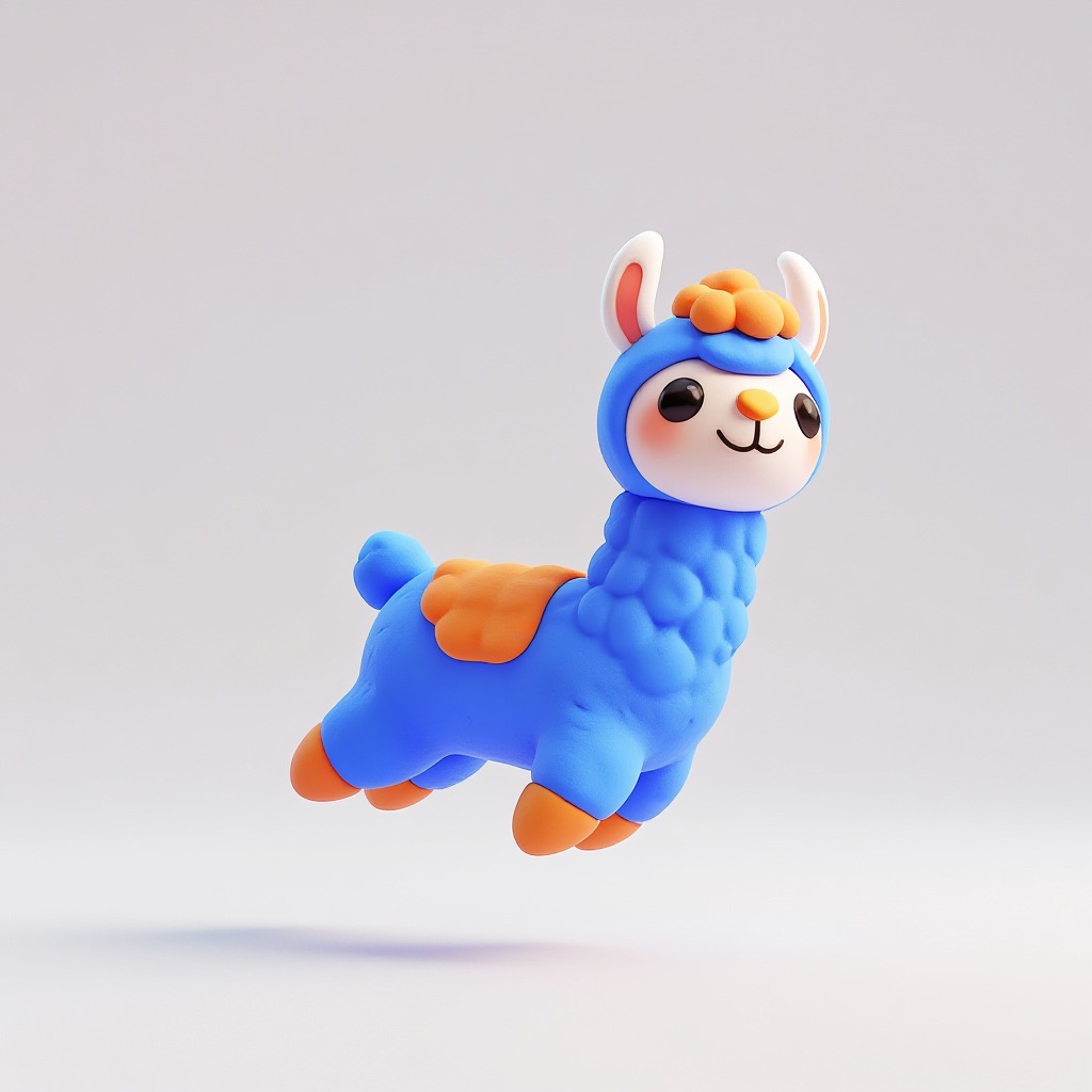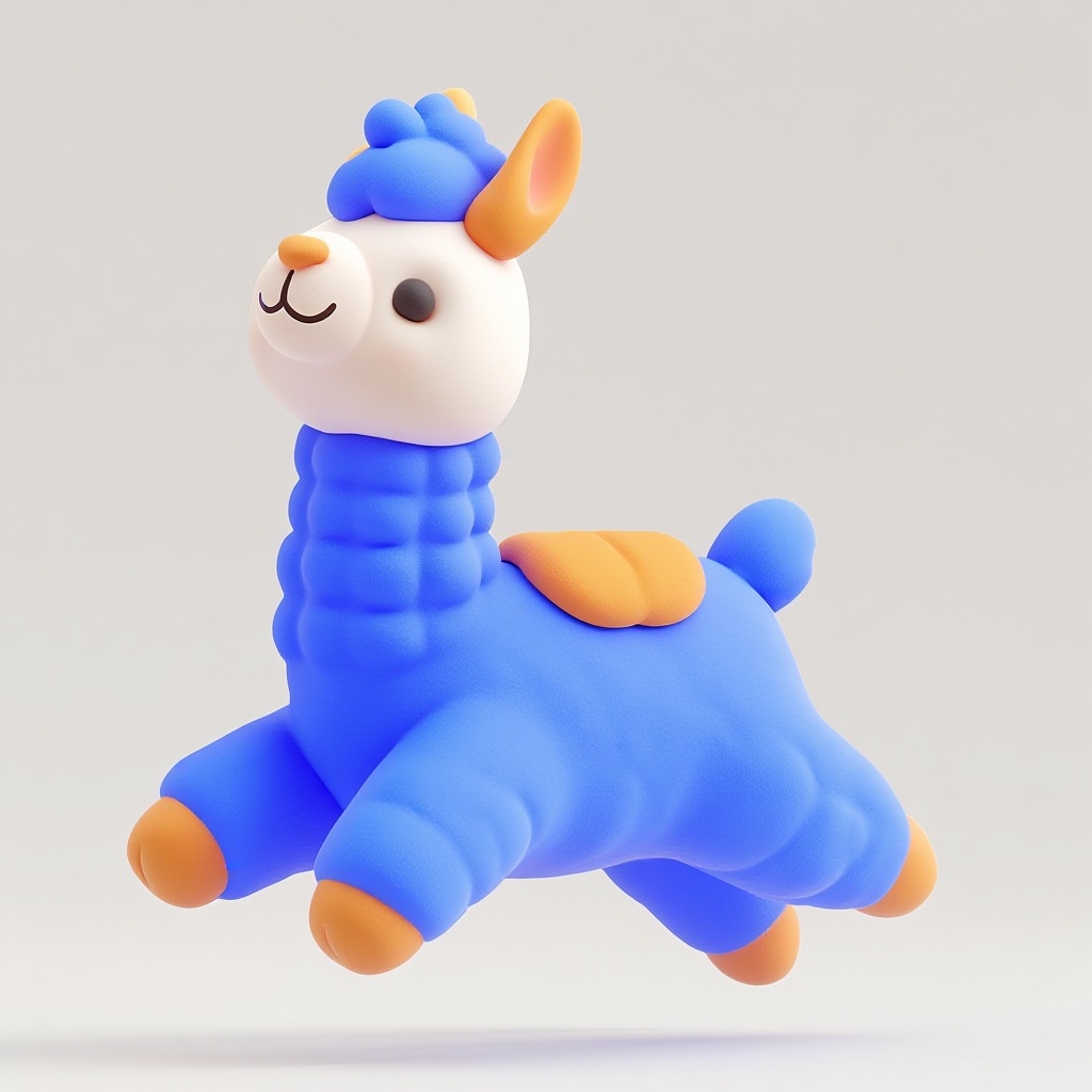 Cute 3D render of a llama , matte surface, kneaded clay icon style, simple stylized design, jumping, smile, rounded proportions, soft sculpted details, playful body language, vibrant blue, orange and white accents, clean white background, minimal composition, soft ambient lighting, subtle shadow, charming character design, high-resolution, polished toy-like aesthetic