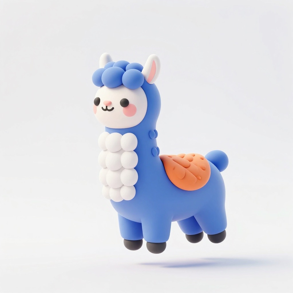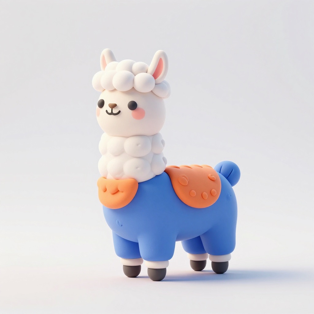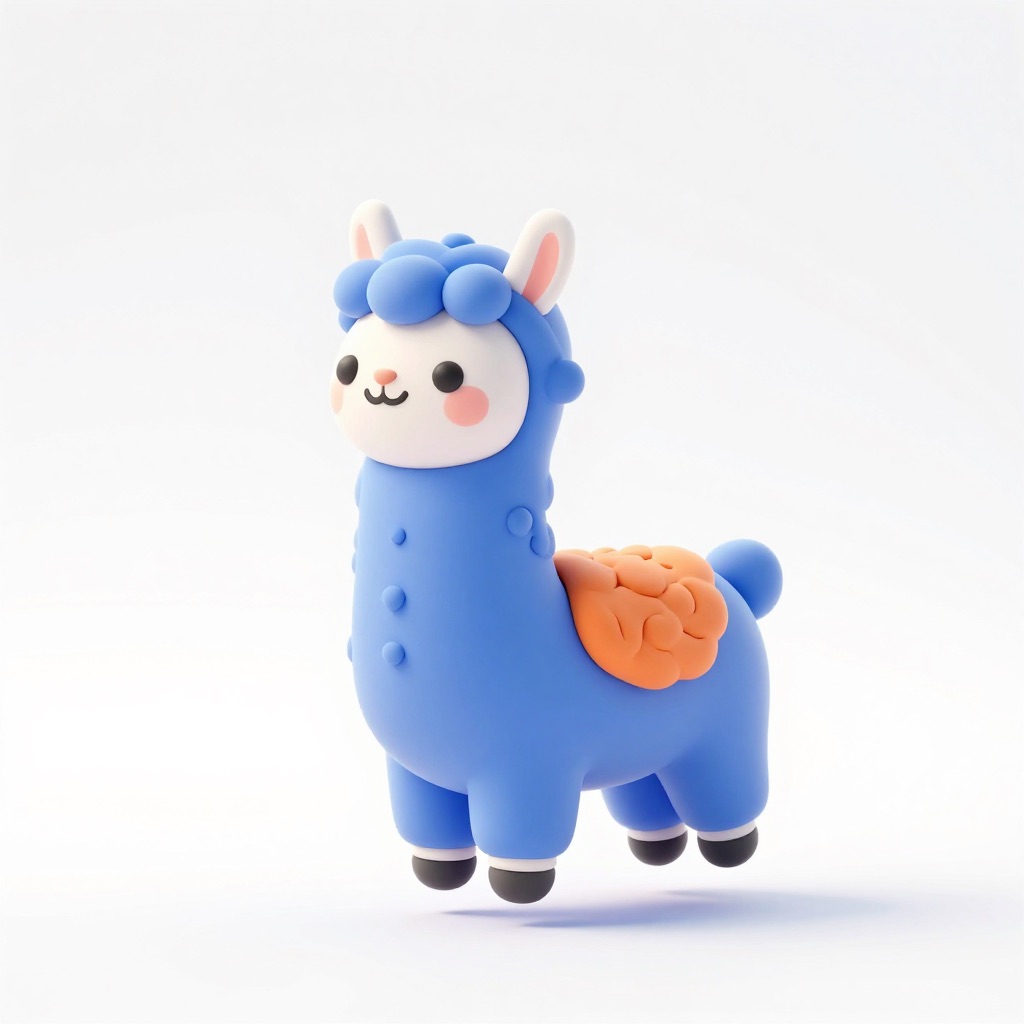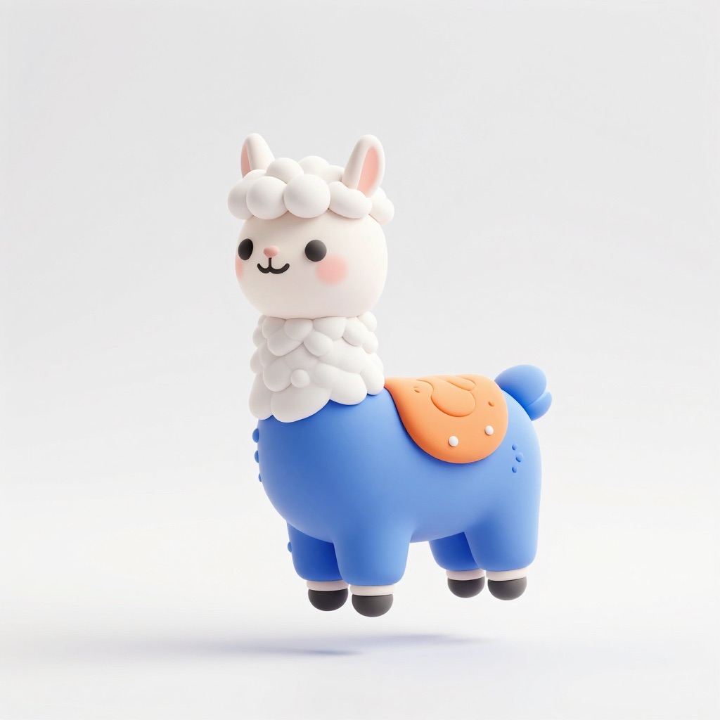 Cute 3D render of a llama , matte surface, kneaded clay icon style, simple stylized design, jumping, smile, rounded proportions, soft sculpted details, playful body language, vibrant blue, orange and white accents, clean white background, minimal composition, soft ambient lighting, subtle shadow, charming character design, high-resolution, polished toy-like aesthetic