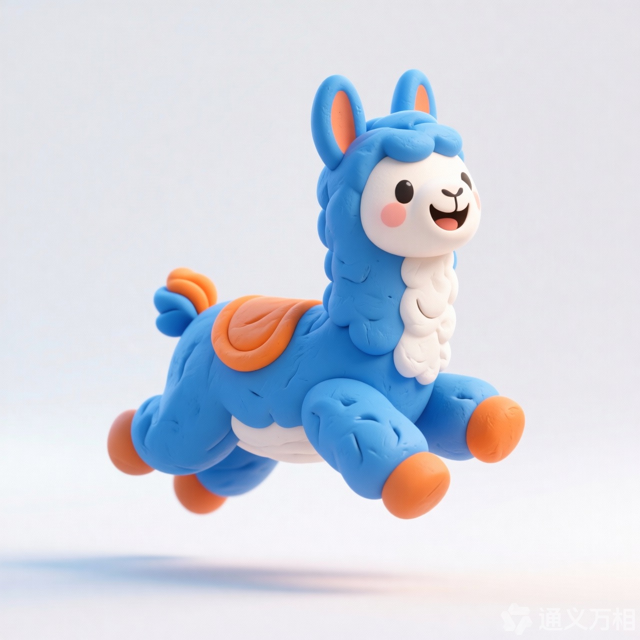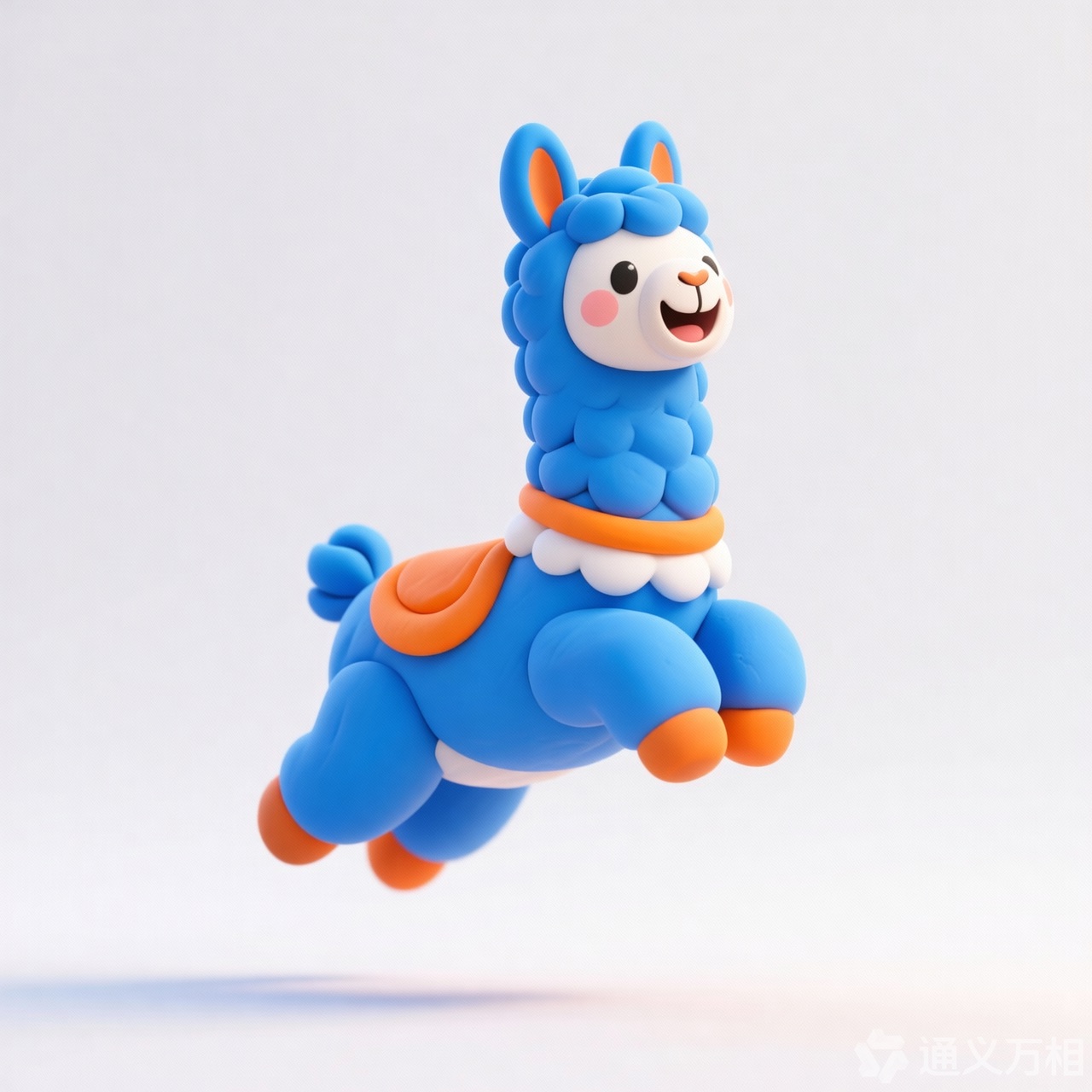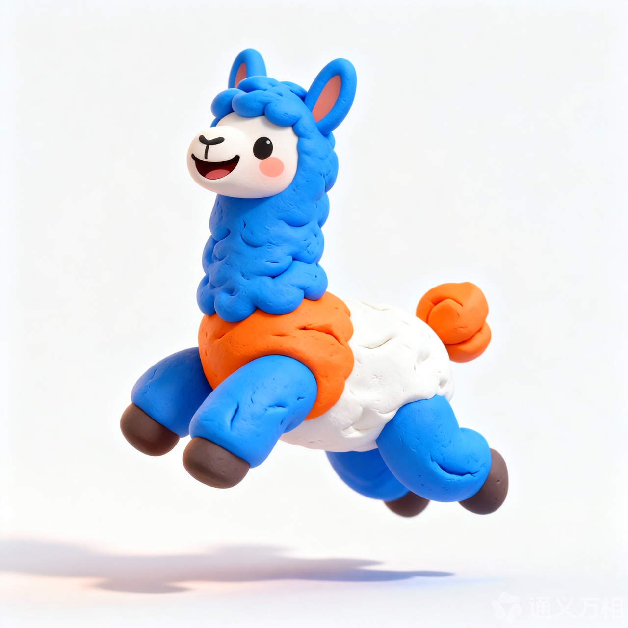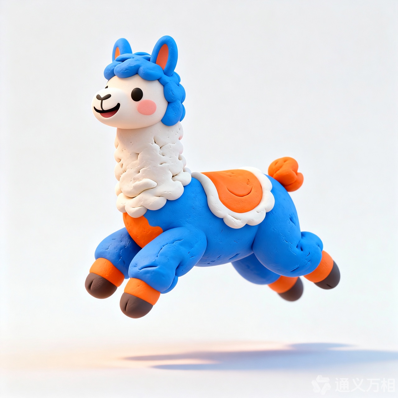 Cute 3D render of a llama , matte surface, kneaded clay icon style, simple stylized design, jumping, smile, rounded proportions, soft sculpted details, playful body language, vibrant blue, orange and white accents, clean white background, minimal composition, soft ambient lighting, subtle shadow, charming character design, high-resolution, polished toy-like aesthetic