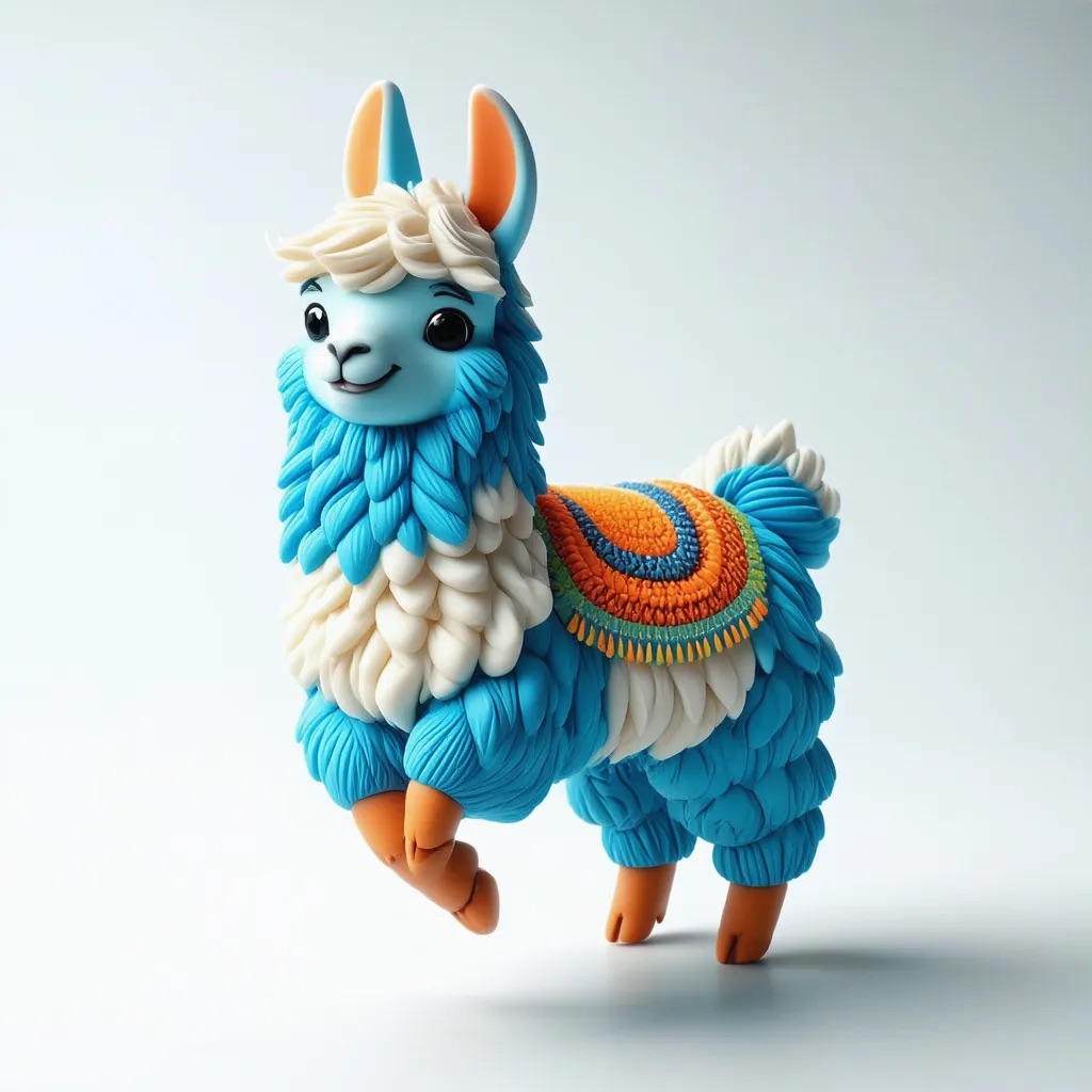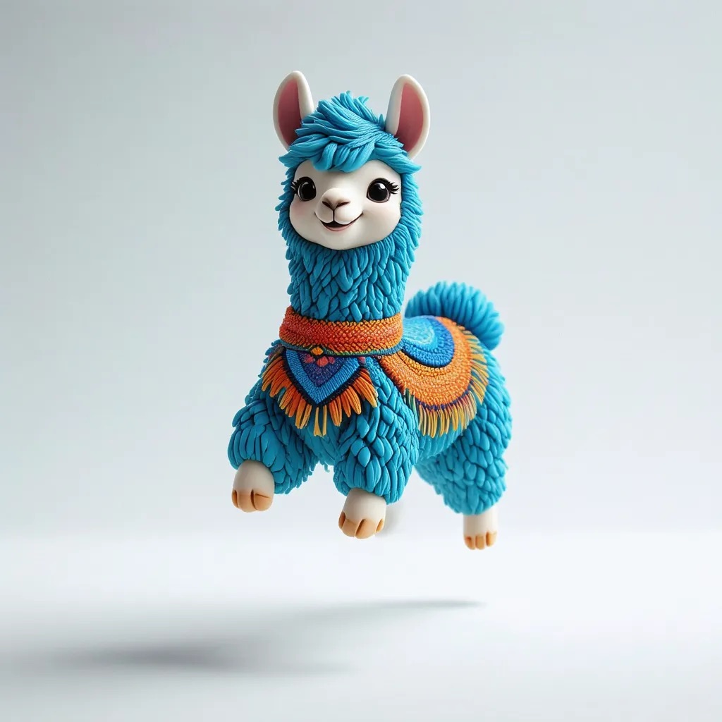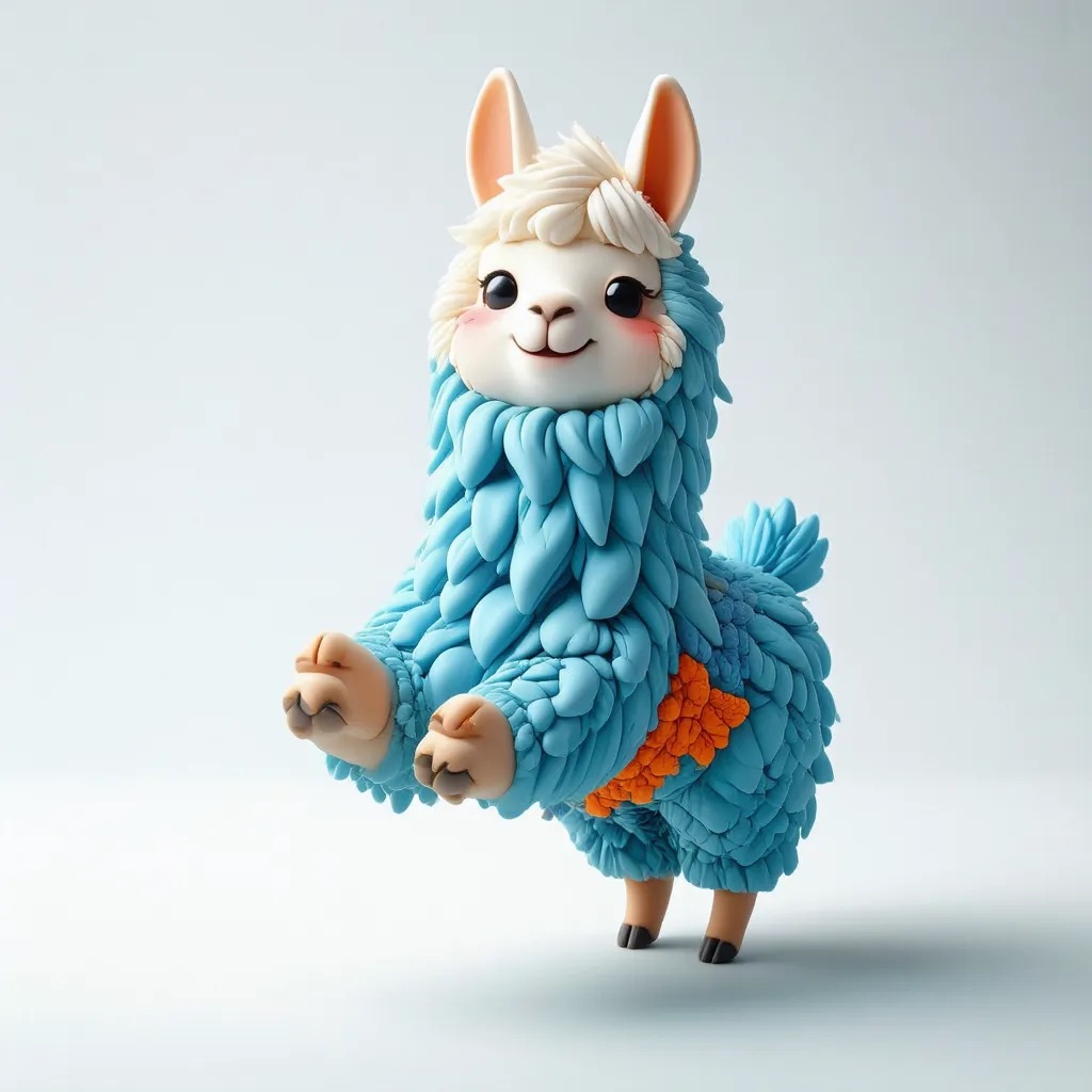 Cute 3D render of a llama , matte surface, kneaded clay icon style, simple stylized design, jumping, smile, rounded proportions, soft sculpted details, playful body language, vibrant blue, orange and white accents, clean white background, minimal composition, soft ambient lighting, subtle shadow, charming character design, high-resolution, polished toy-like aesthetic