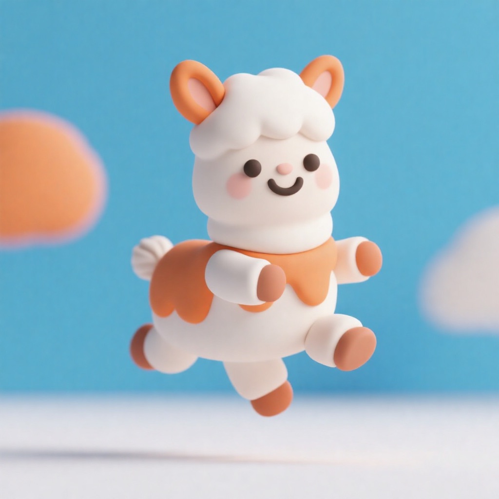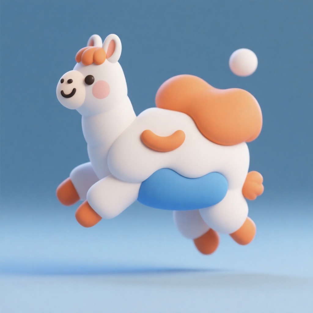 Cute 3D render of a llama , matte surface, kneaded clay icon style, simple stylized design, jumping, smile, rounded proportions, soft sculpted details, playful body language, vibrant blue, orange and white accents, clean white background, minimal composition, soft ambient lighting, subtle shadow, charming character design, high-resolution, polished toy-like aesthetic