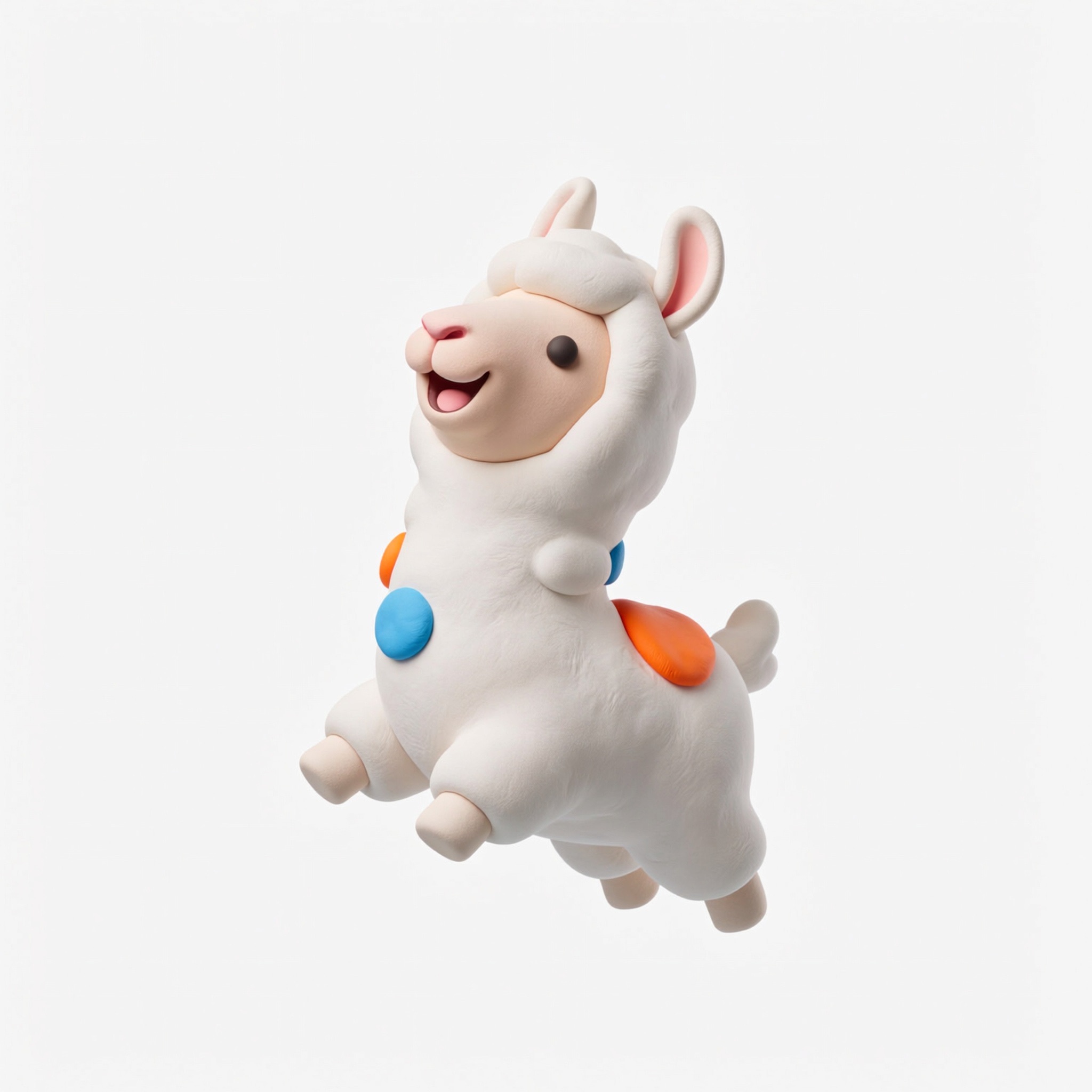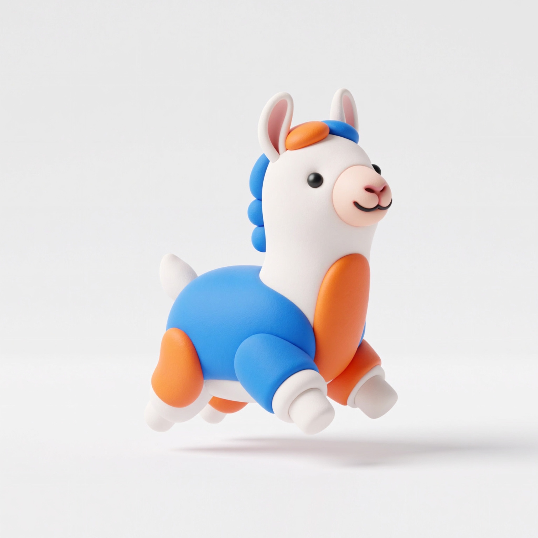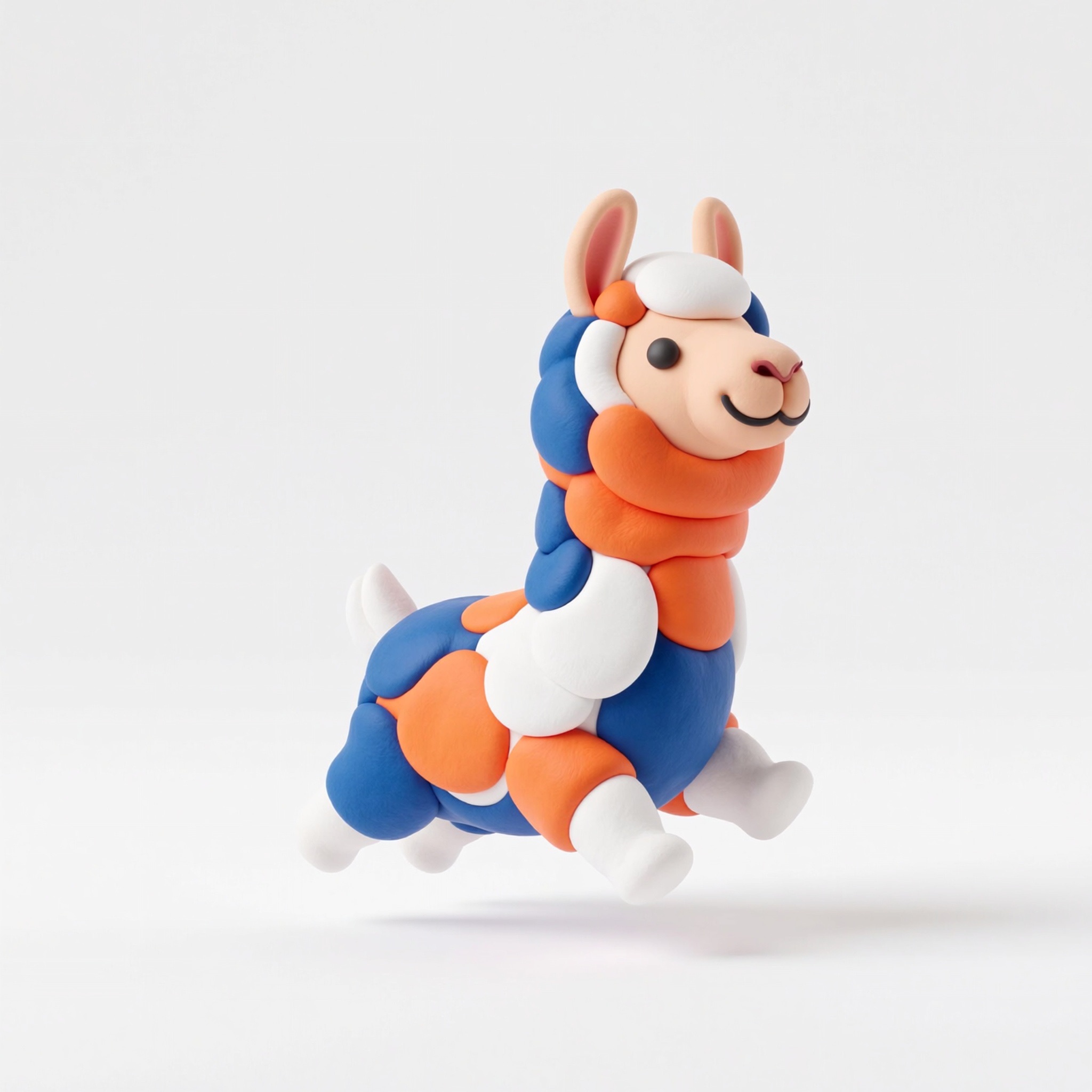 Cute 3D render of a llama , matte surface, kneaded clay icon style, simple stylized design, jumping, smile, rounded proportions, soft sculpted details, playful body language, vibrant blue, orange and white accents, clean white background, minimal composition, soft ambient lighting, subtle shadow, charming character design, high-resolution, polished toy-like aesthetic