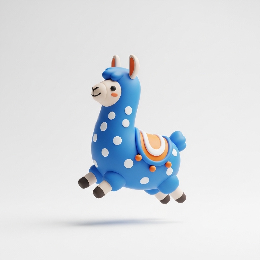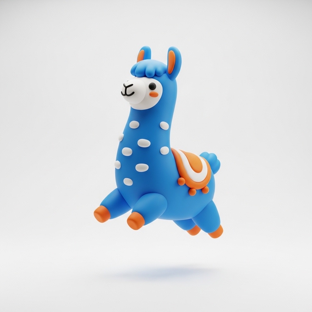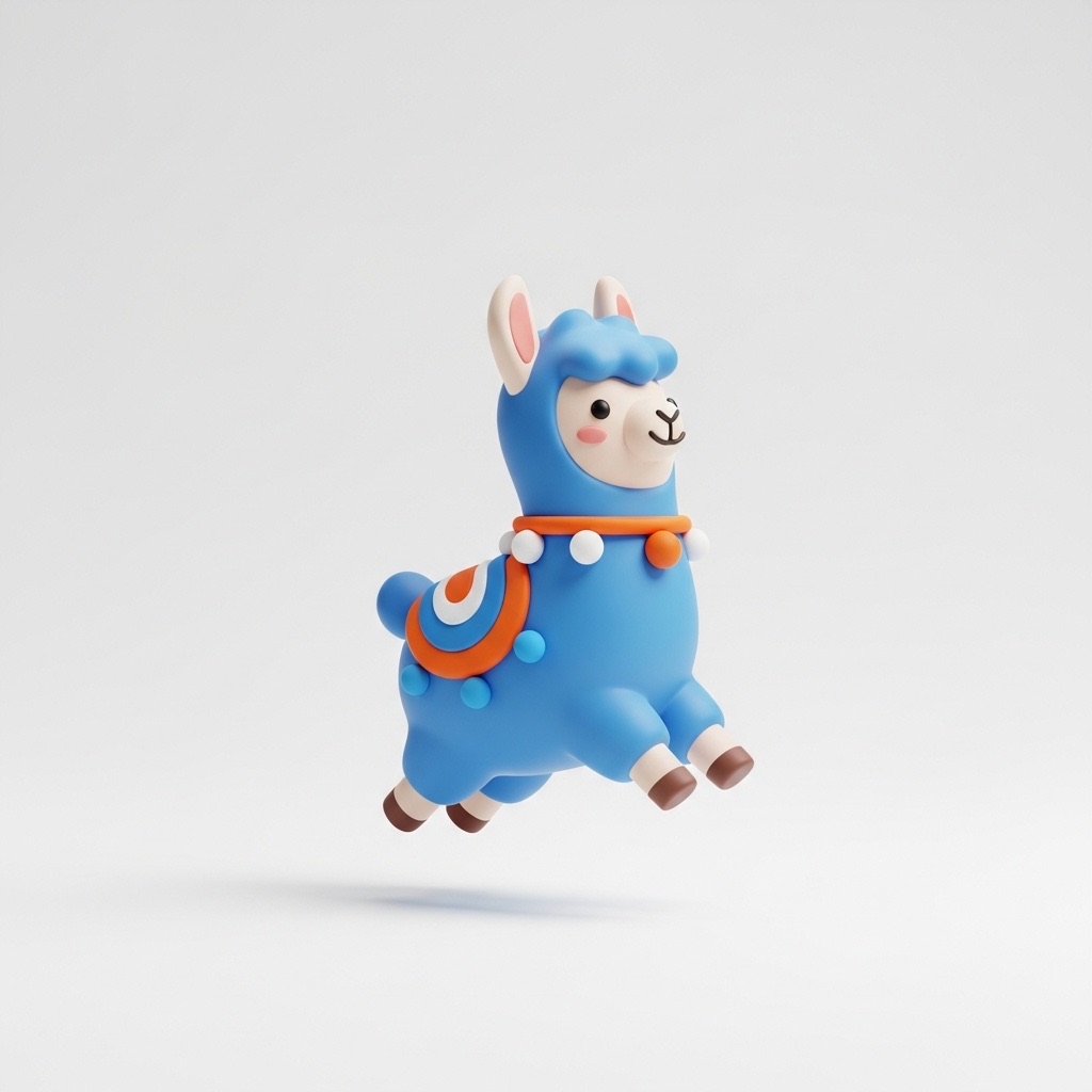 Cute 3D render of a llama , matte surface, kneaded clay icon style, simple stylized design, jumping, smile, rounded proportions, soft sculpted details, playful body language, vibrant blue, orange and white accents, clean white background, minimal composition, soft ambient lighting, subtle shadow, charming character design, high-resolution, polished toy-like aesthetic