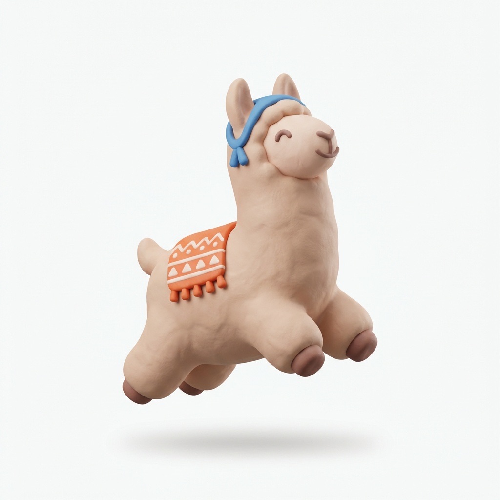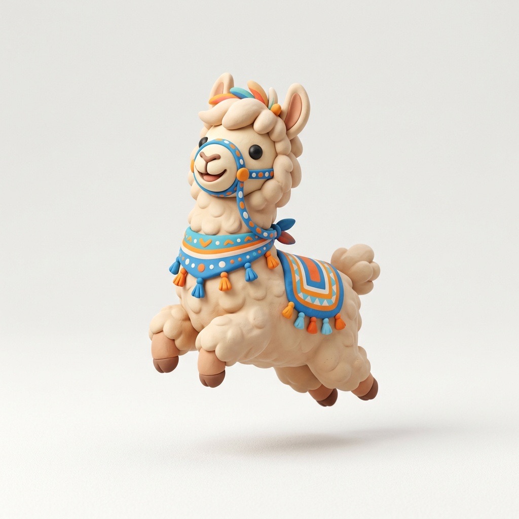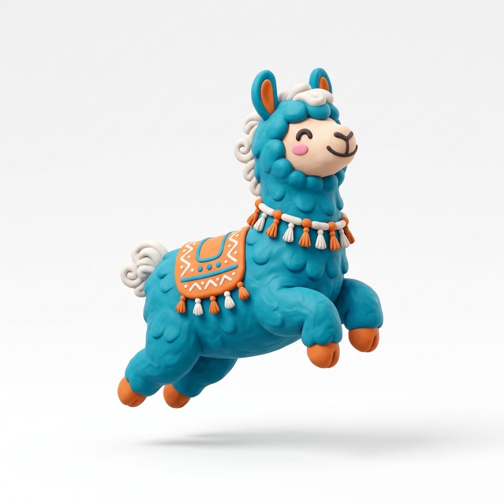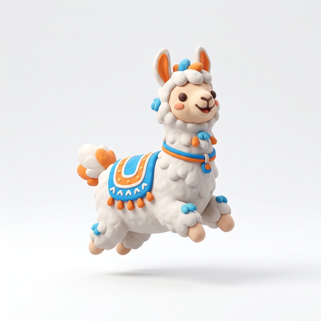 Cute 3D render of a llama , matte surface, kneaded clay icon style, simple stylized design, jumping, smile, rounded proportions, soft sculpted details, playful body language, vibrant blue, orange and white accents, clean white background, minimal composition, soft ambient lighting, subtle shadow, charming character design, high-resolution, polished toy-like aesthetic