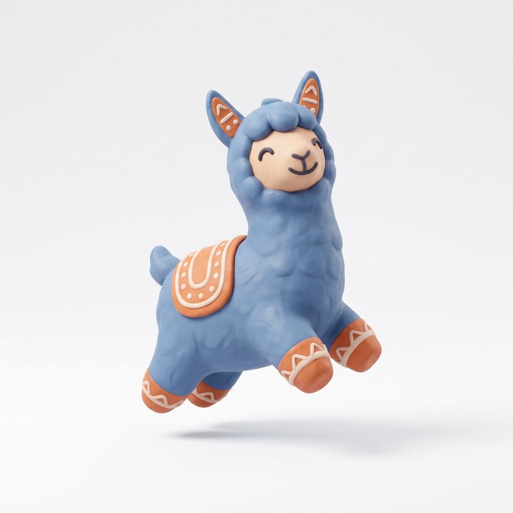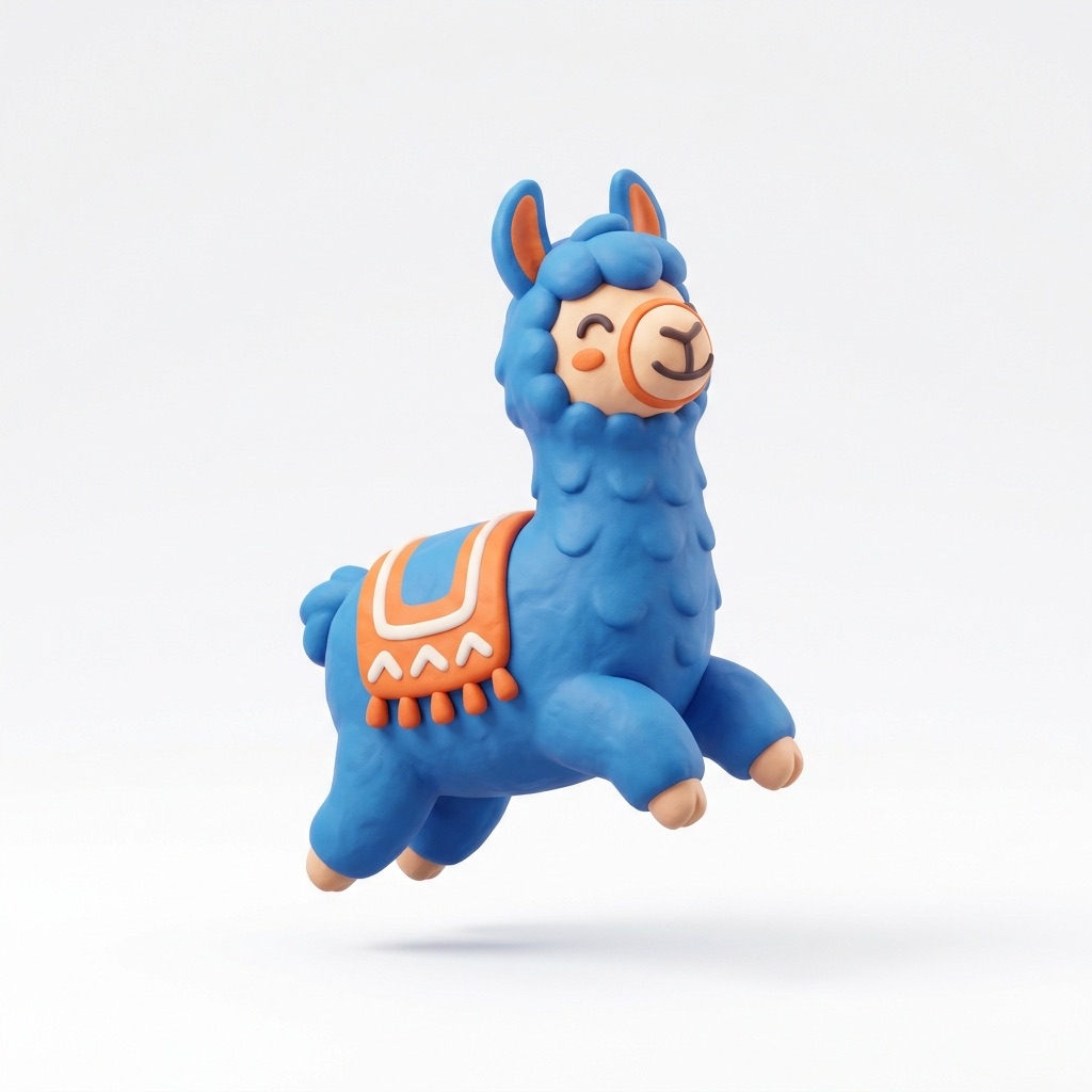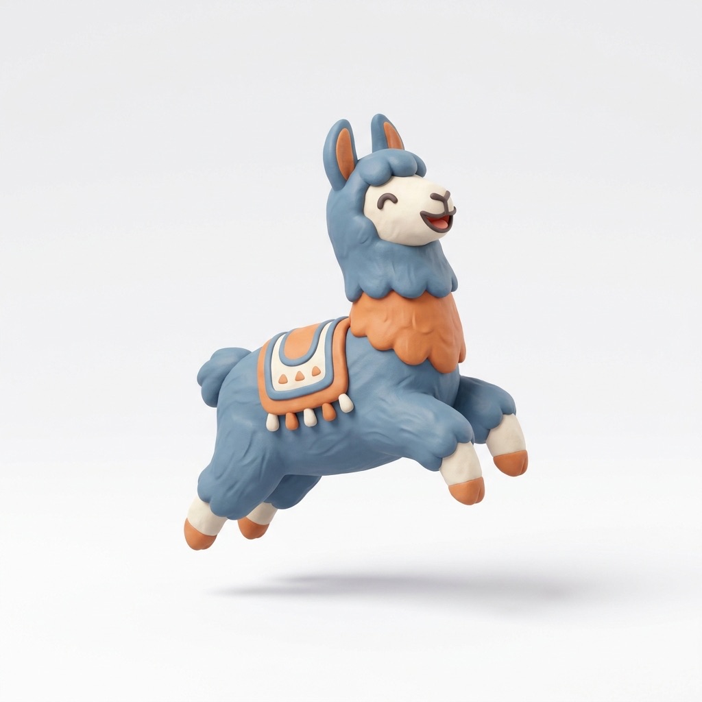 Cute 3D render of a llama , matte surface, kneaded clay icon style, simple stylized design, jumping, smile, rounded proportions, soft sculpted details, playful body language, vibrant blue, orange and white accents, clean white background, minimal composition, soft ambient lighting, subtle shadow, charming character design, high-resolution, polished toy-like aesthetic
