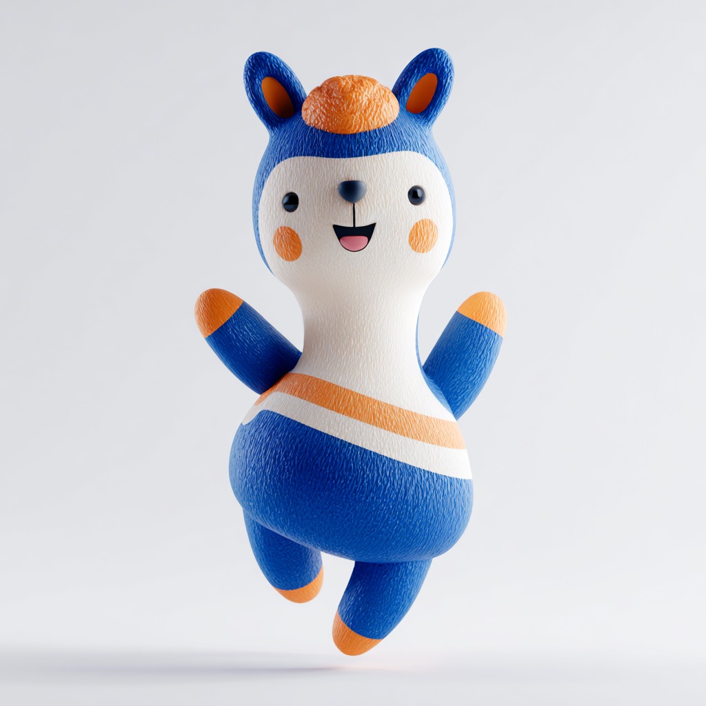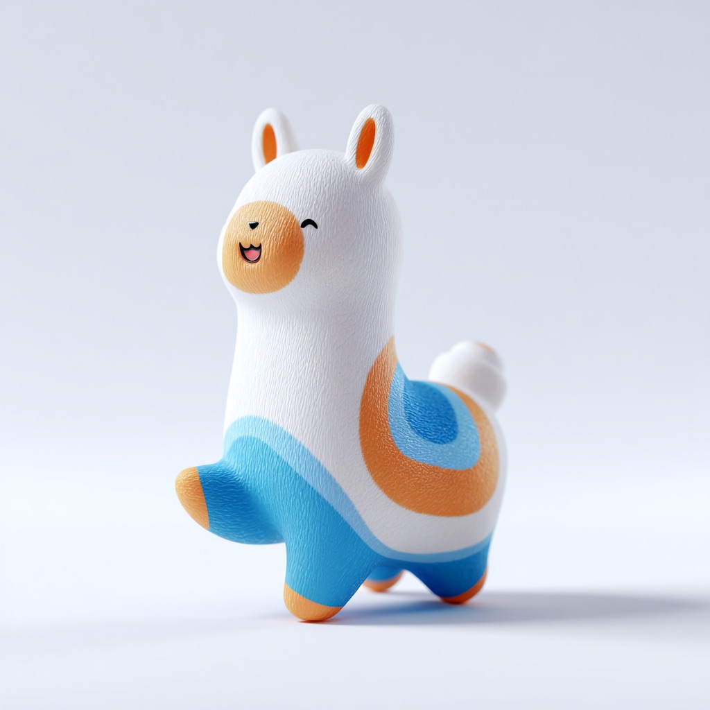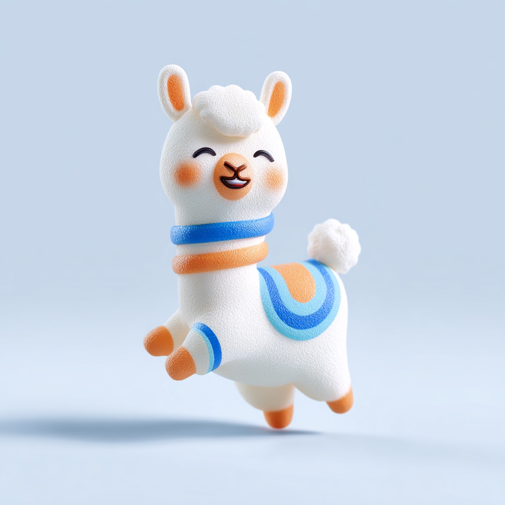 Cute 3D render of a llama , matte surface, kneaded clay icon style, simple stylized design, jumping, smile, rounded proportions, soft sculpted details, playful body language, vibrant blue, orange and white accents, clean white background, minimal composition, soft ambient lighting, subtle shadow, charming character design, high-resolution, polished toy-like aesthetic